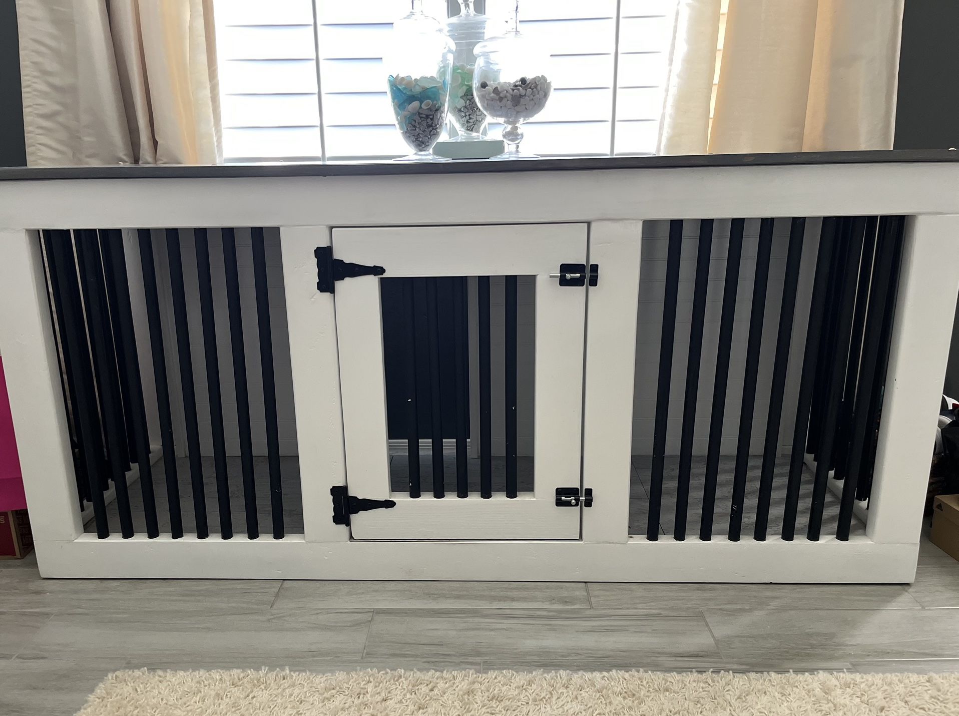 This is a one of a kind beauty. Custom made for our dog who decided he will not use it. There is a cut out on the back which can be put up against a wall if needed but it was made to go over a doggy door perfectly so our pup could have in/out privileges. Flooring is a laminate gray look. This piece is breathtaking, heavy and would be an amazing addition to someone’s home. Farmhouse style, will need two people and a truck minimum. Can be used as a tv stand, Entry buffet, credenza, etc. 69 L x 23 W x 31.5-31.75 H Cash only, pick up at 91st and Deer Valley