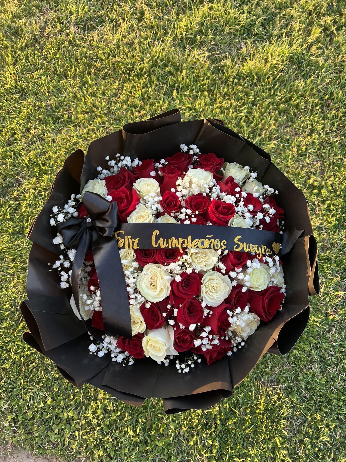 50 red and white roses with baby’s breath