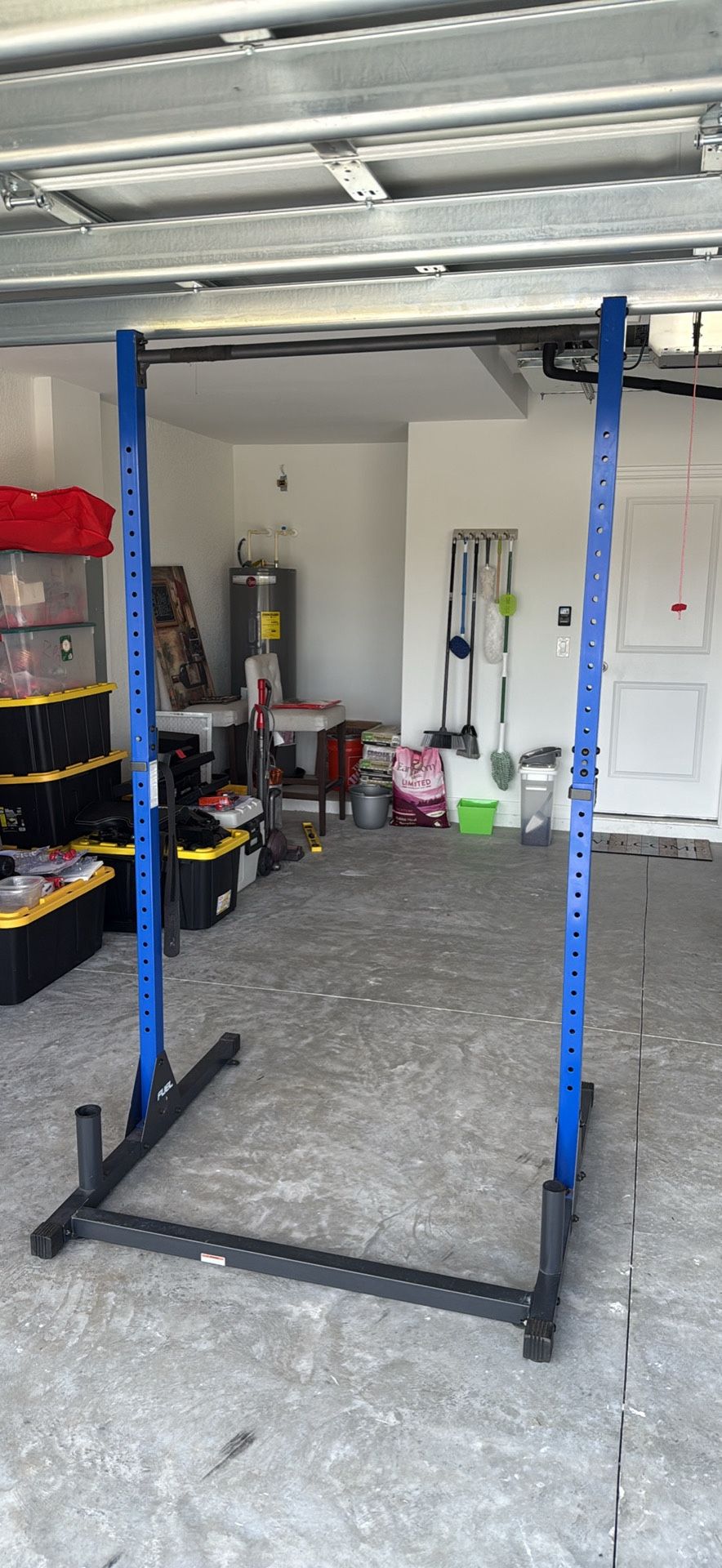 Pull up br, approximately 7 feet tall. Perfect for pull ups, it also has attachments to put a barbell for squatting and benching.