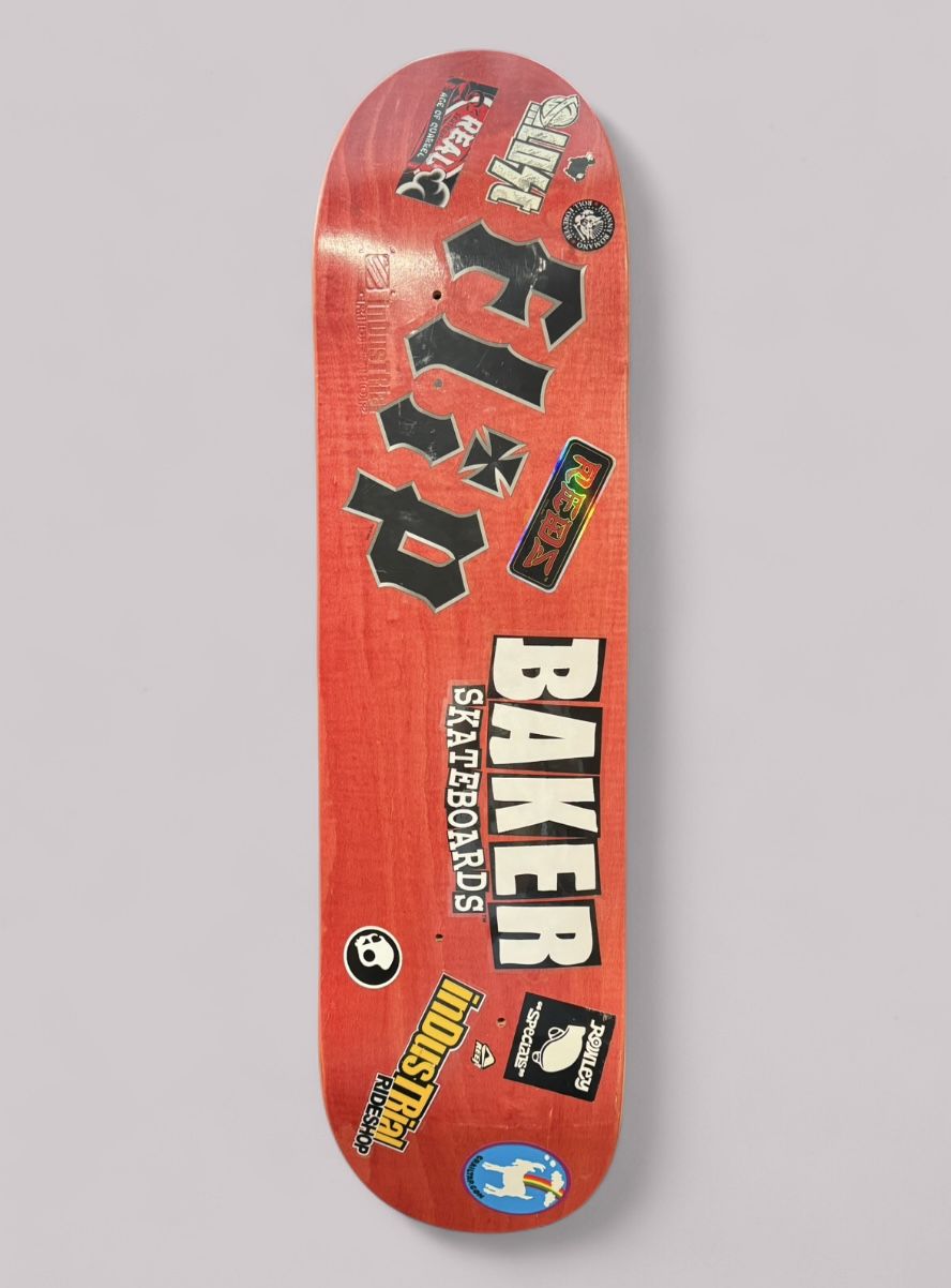This is an Industrial Rideshop Skateboard deck that was hanging on a wall - has never been skated. Red with stickers. Can be gripped for additional fee.