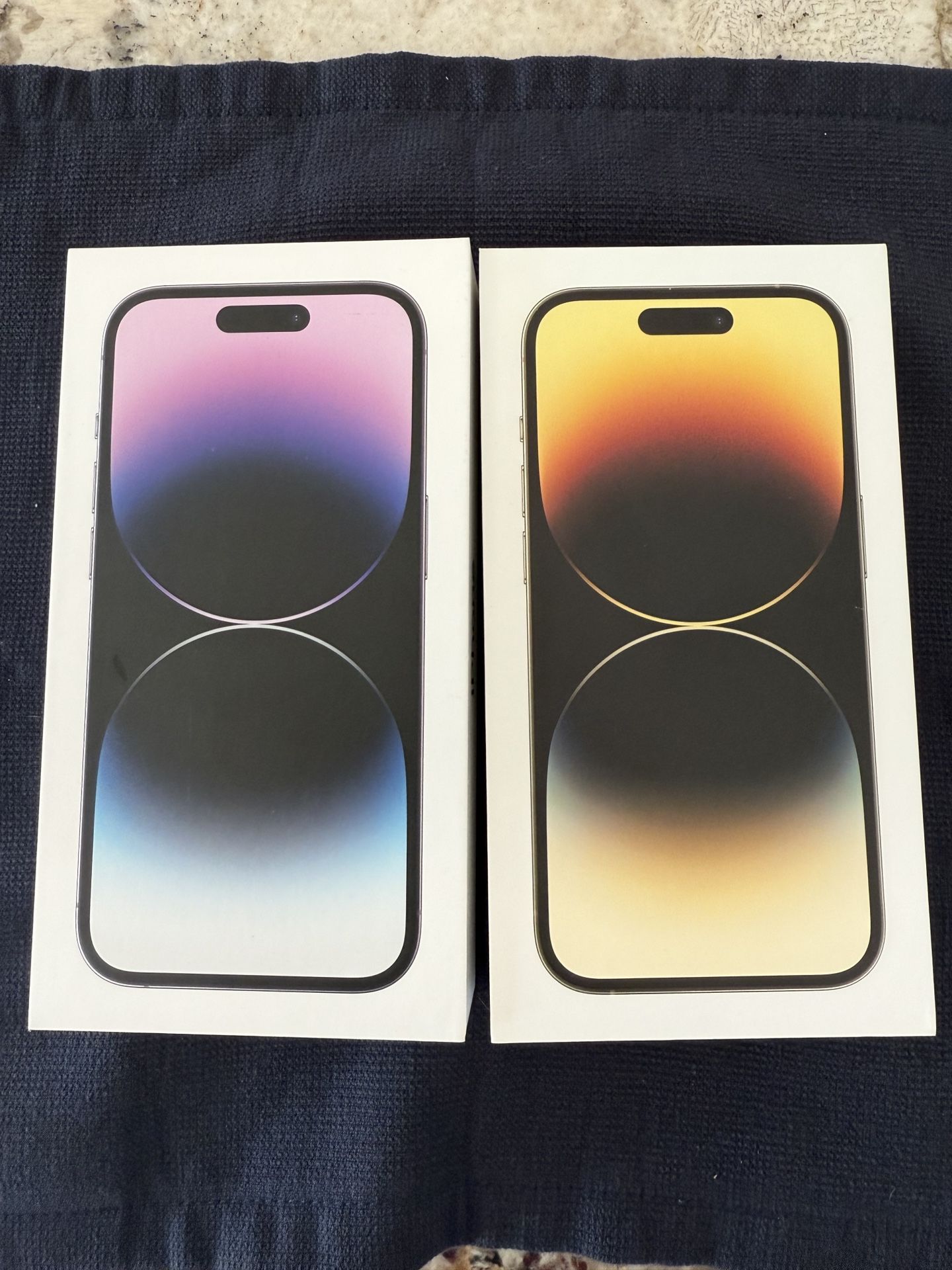 Two used iPhone pro 14. Both 512GB $1100 for two iPhone pro 14 as pictured. Or $650 each as pictured Like new with box Unlocked Battery life is 85% & 86% Cash only. I won’t reply to low ballers or trades. If you have any questions? I will reply back asap. Thxs.