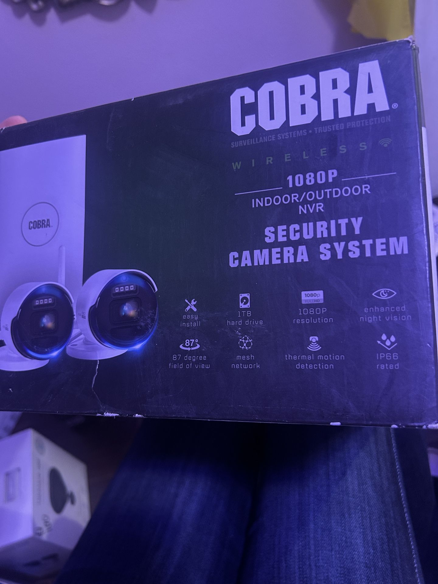 COBRA Surveillance System. This all-in-one solution is easy to install and packed with advanced features for complete protection. Features: • Wireless System – No messy cables • 1080P Full HD Resolution – Clear and detailed video • Indoor/Outdoor Use – IP66 rated for weather resistance • Enhanced Night Vision – Monitors your property day & night • Thermal Motion Detection – Smart alerts for unusual activity • Mesh Network – Reliable connectivity • Field of View: 87° wide, 7° tilt adjustment • 1TB Hard Drive Included – Plenty of storage for recordings • NVR (Network Video Recorder) – Centralized video management • Easy Install – Get your system running in minutes