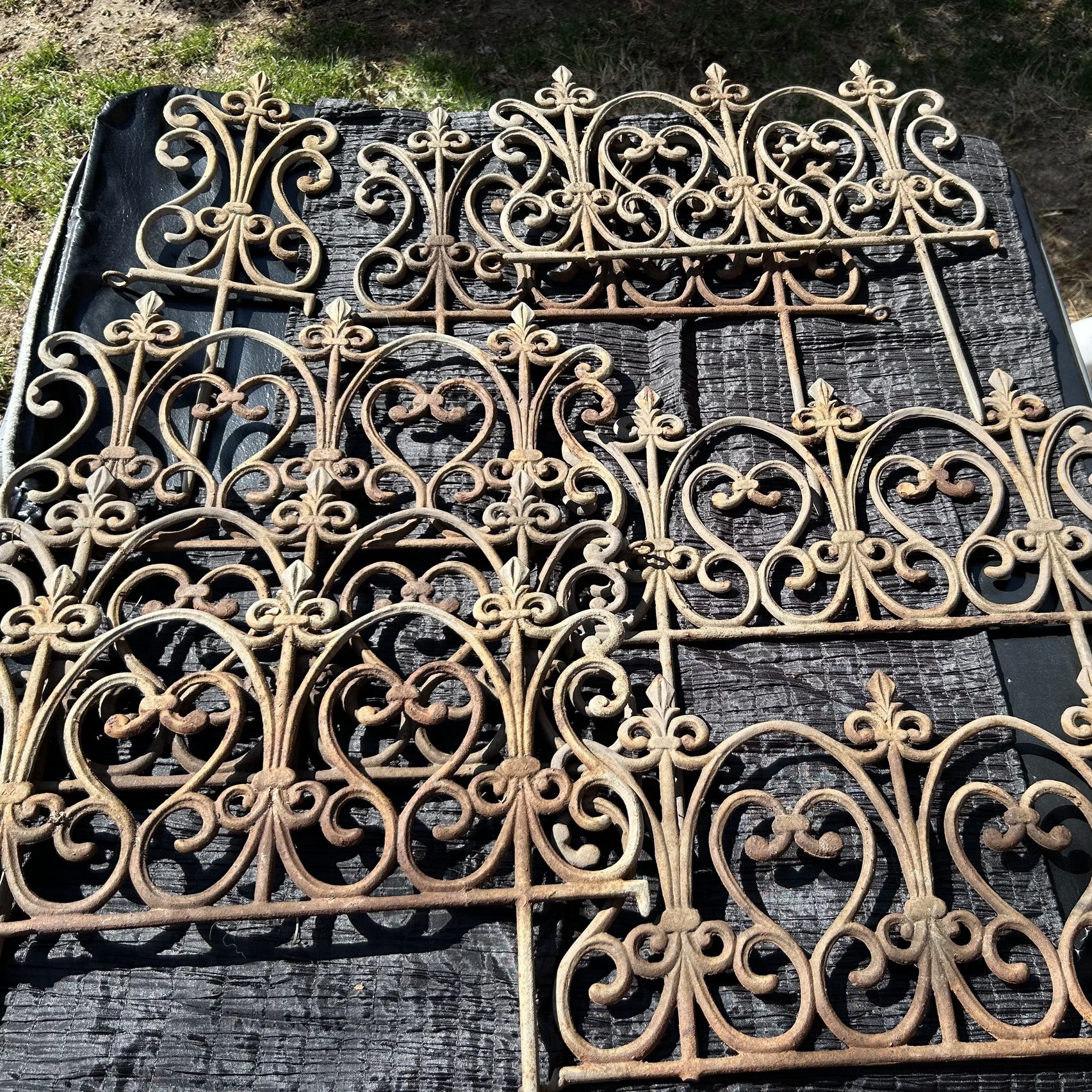 Antique cast iron garden fence panels, set 8 total 11.5ft. 7 panels Measure 19” across x 10”high (additional 8” ground stake) 1 narrow panel is 7” across. 6 panels have only 1 ground stake;1 both stakes broke off and 1 panel has both stakes. Rusty old condition.