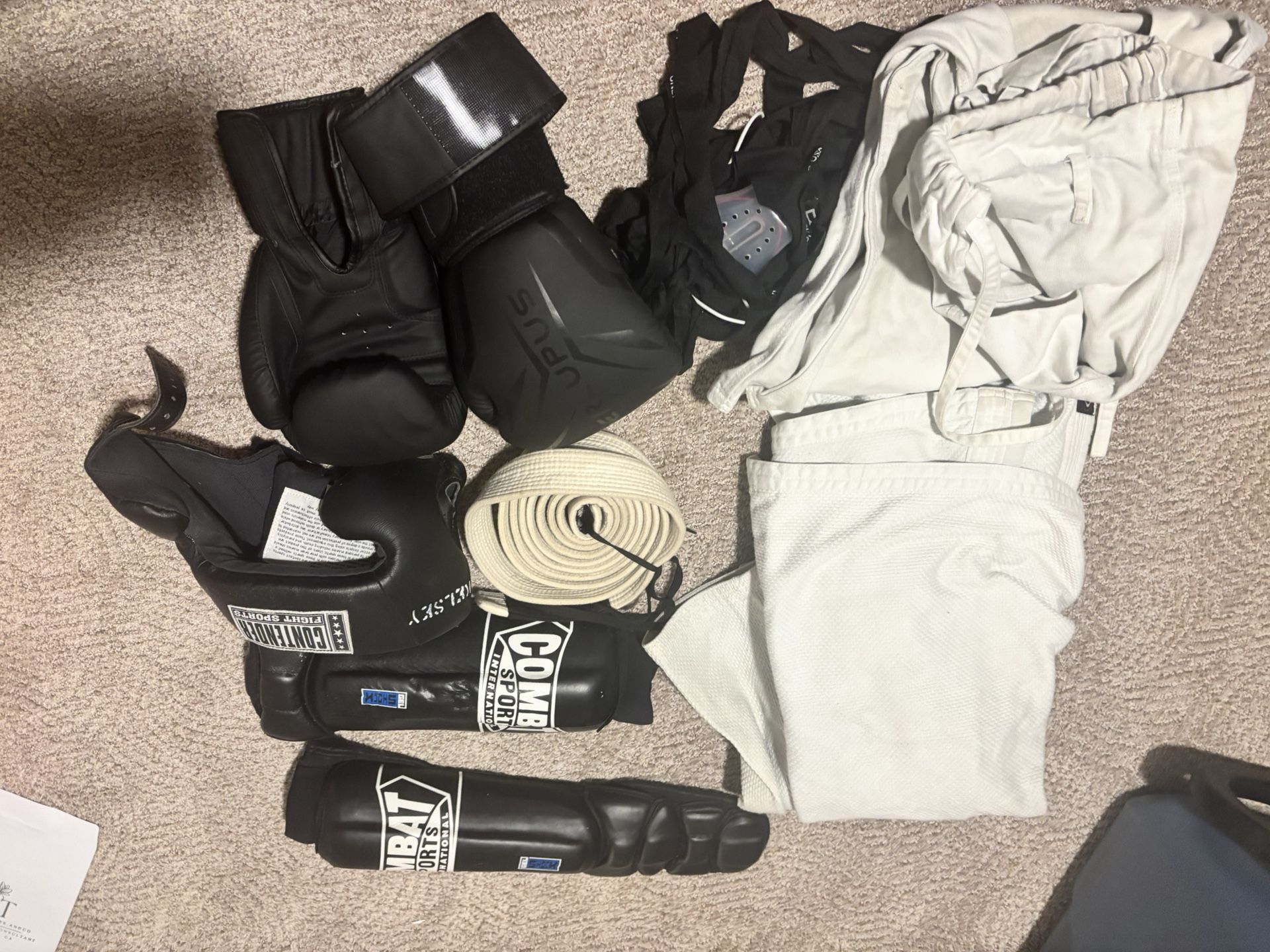 Selling a full set of martial arts / boxing training gear in good condition. Ideal for MMA, Muay Thai, boxing, or general martial arts training. Everything pictured is included. All deep cleaned and steamed. Includes: • Boxing gloves (Combat Sports) • Shin guards (Combat Sports) • Protective headgear • Groin protector • Martial arts GI (white, top & pants) • Belt • Additional protective pads/accessories (see photo) Condition: • Light to moderate use • No rips or structural damage • Clean and ready to use