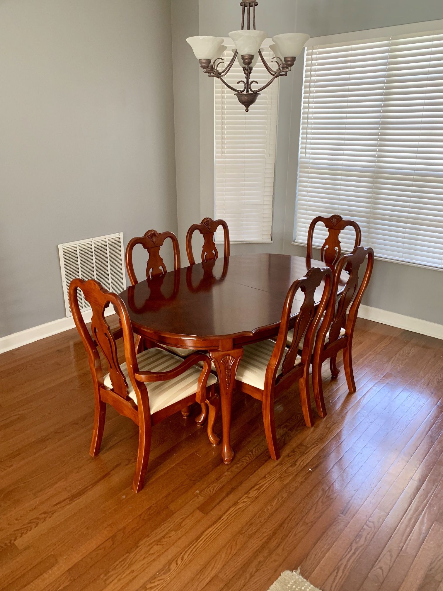 Dining room table & 6 chairs, cherry wood color, light cream striped fabric cushions. Very good condition, and chair cushions are in perfect condition. Comes with leaf insert. Smoke-free home. There are 2 captain chairs and 4 armless chairs. (Must provide your own transportation) Table Dimensions: 66" Length 84" Length with leaf installed 42" Wide 30" Tall