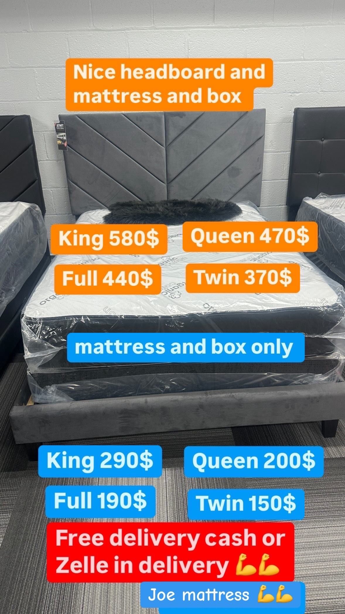 Huge sale for Mattress And Box Twin size mattress and box 150.$ full 190$ Queen 200$ king 290$. Mattress And Box and frame and headboard. King 580$ Queen 470$ full 440$ twin 370$ free delivery free set up 708….280….7715…