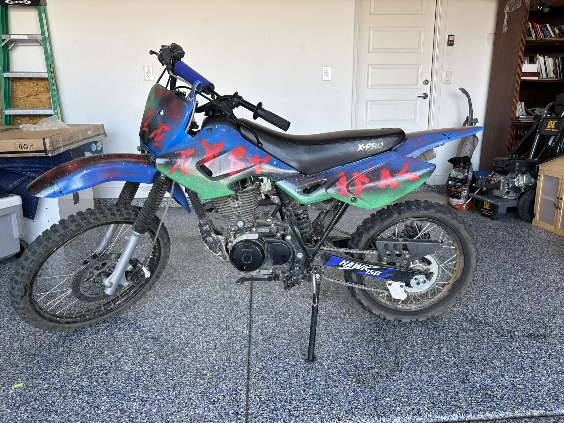 X-PRO Hawk 150cc Youth Dirt Bike Adults Pit Bike,Big 19"/16" Wheels! (Blue, Factory Package). Comes with 1 year warranty to fix anything that might break. Bough it at Amazon for Christmas last year for my son. Shipping alone is $300 and the warranty was $250, so you’ll save all that. This is a great starter dirt bike, my son custom designed painted, he use it for about a year and has been great and now needs something bigger. There is nothing wrong with it just a few scratches (pictures shows them).