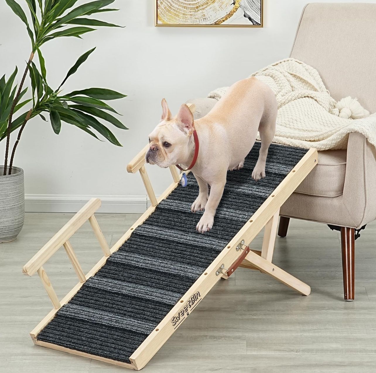 New! Unopened! Dog Ramp for Bed - Car Ramp for Dog - Anti-Slip Carpet - 39" Long Adjustable 16"-24" Dog Ramp for Small Dogs Medium Dog - Dog Ramp for Couch, Bed or Sofa, Folding Portable Wooden Pet Ramp This dog ramp is 39 inches,. 39-inch dog ramp is suitable for couch, car and low beds (no higher than 24 inches). All dogs from small to large are suitable for ramp The pet ramp reduce the dog's muscle and joint straining caused by jumping, make it easy for small, medium, old, and injured dog to reach sofas, beds, cars, and more. The versatile design of the dog ramp for car enables them to fit most furniture and cars The pet ramp can be adjusted to 6 heights -14, 16, 18, 20, 22 and 24 inches, it helps your pets easily reach the car, bed or couch. Ramp folds flat to just 2.2in for easy storage and transport. Non-slip fabric covers dog ramp & providestraction for your pet's paws. The 7 anti-slip crossbars structure is designed to keep your pet from slipping when on the ramp. The bottom non-slip mat will protect your floor surface from scratches. The folding dog ramp is made of pure natural knotless pine material, smooth surface, and will not scratch your hands.