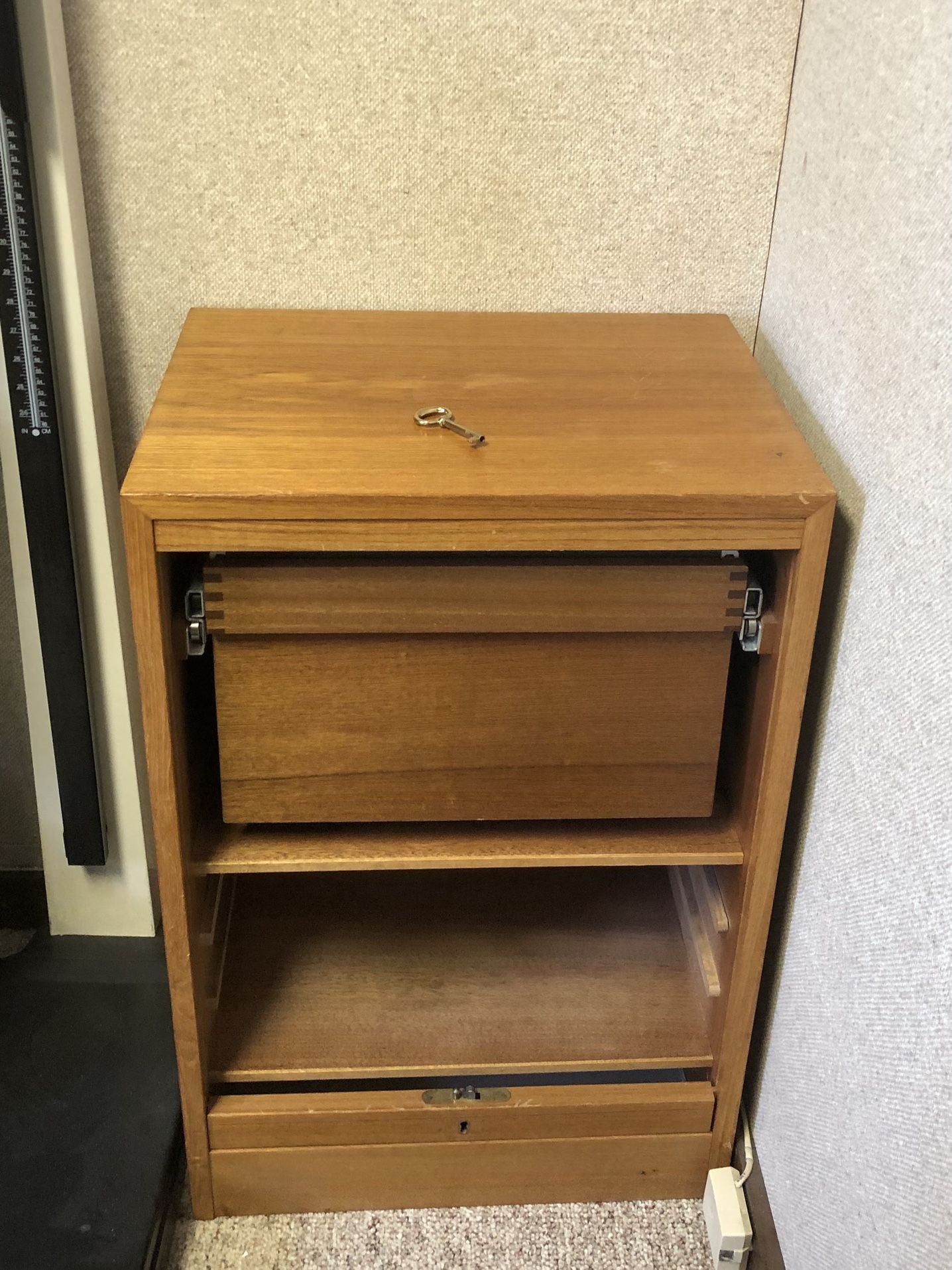 Excellent condition wooden file cabinet with space for additional storage. Contains a sliding door with lock and key. Very sturdy, durable, and well kept. Price is negotiable.