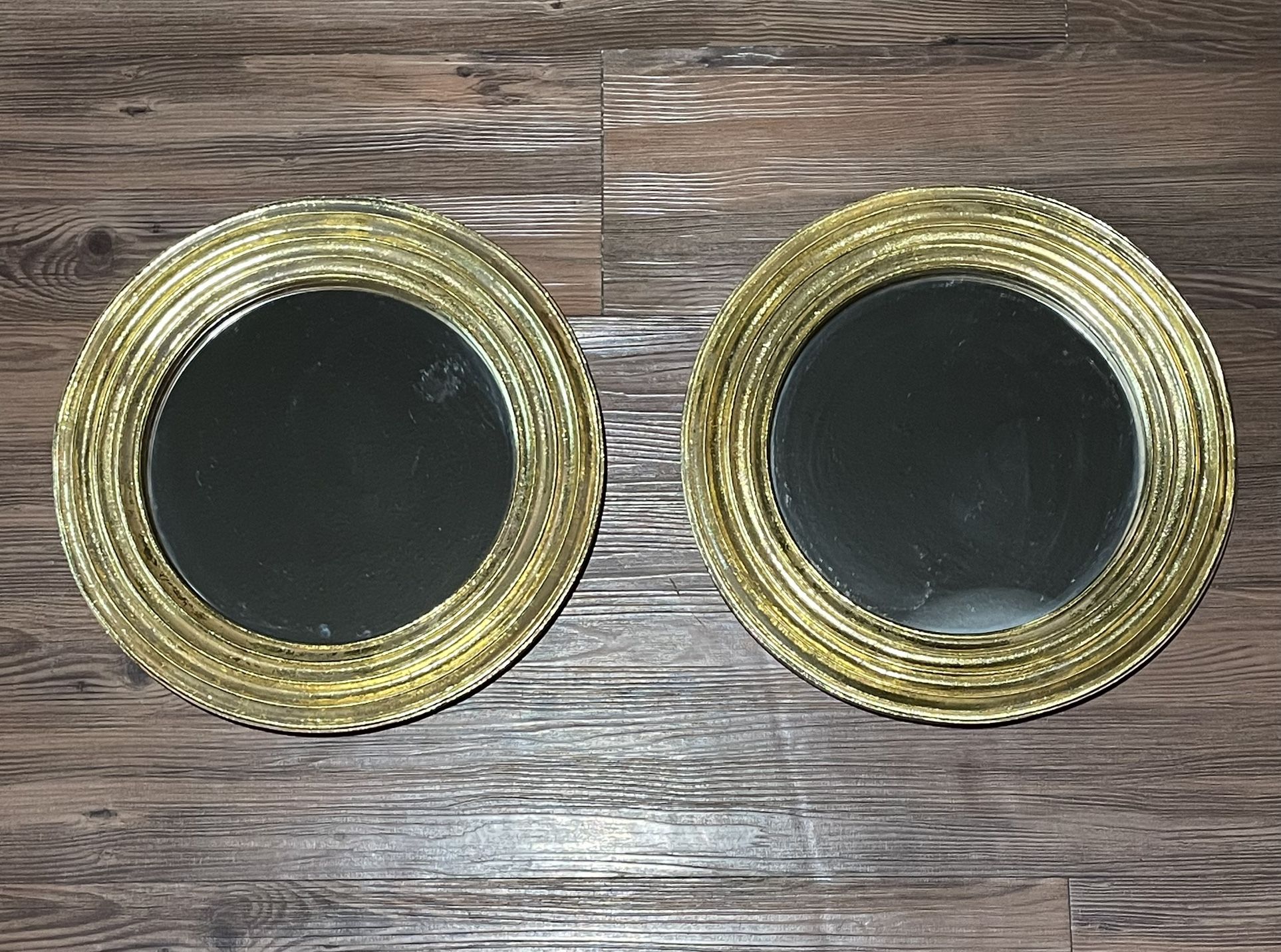 Two Round Gold Wooden Wall Mirrors . Two round gold gilded mirrors. Very good condition no cracks or scratches on mirrors, comes as a set of 2, 13.5 inches in diameter, intended to be hung on a wall. Pick up only, Palm Desert, CA