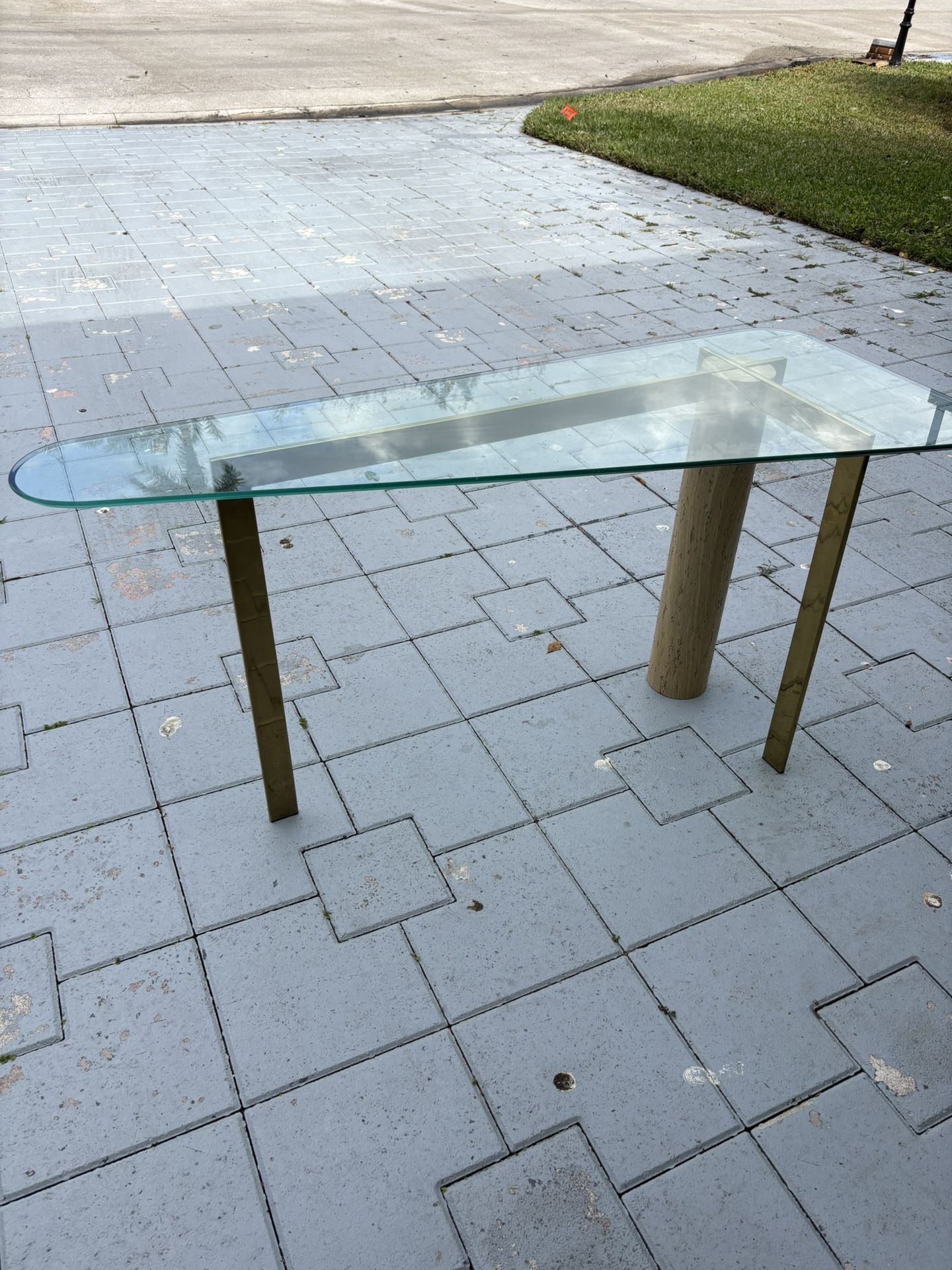 Beautiful glass and beige marble base table Great condition, thick rounded glass