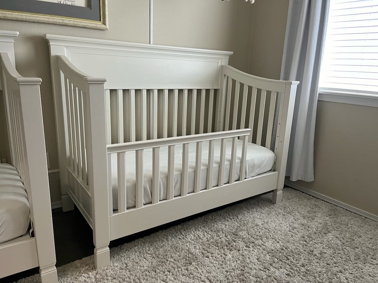 Pottery barn kids Larkin 4-in-1 bed set for baby/toddler/child. Selling identical complete bed set including baby crib, adjustable conversion for crib, toddler bed conversion kit and rail, mattress, and mattress protector. Please see photo for dimensions. All was purchased from pottery barn new. PBK Larkin crib PBK Larkin crib conversion (adjustable height) PBK Larkin Toddler bed conversion Pottery Barn Kids Two-stage Lullaby crib mattress Pottery Barn Kids Essential Crib/Toddler Waterproof Mattress cover Please note this is a used item and while in good condition, it has a few imperfections pictured and described here. There are some imperfections on the interior of crib that are covered with mattress insert. There are also some minor intents on the toddler conversion piece (none on baby crib). Pictured for reference. Specs copied and pasted from pottery barn kids website, below. Message with any questions. HOW IT IS CONSTRUCTED Larkin Camelback 4-in-1 Convertible Crib * Crafted of solid poplar wood, bass wood veneers and MDF (medium density fiberboard). * All wood is kiln-dried, a process that ensures that the furniture will never split, warp, crack or mildew. * Finish is applied in multi-step process using child-safe, water-based paint. The paint provides durability, richness and depth of color to each piece. * The Larkin Convertible Crib has elegant details like a camelback side panel, square post feet, fluted slats, crown molding along side rails and frame and panel bases on all sides. * Mattress platform offers four height options to accommodate your growing baby. * Platform can be adjusted to the following heights: 22.5", 18.5", 15", 11". * This contract-grade item is manufactured to meet the demands of commercial use in addition to residential. Pottery Barn Kids Lullaby 2-Stage Crib Mattress * Durable reinforced seam and fabric bindings offer long-lasting performance. * 120 interlocking coils provide optimal support. * Natural cotton wrap, sleep firm layers and thermo-bonded polyester layers. * Mattress edge has a reinforced border wire and Innofoam corner wraps. * Two-in-one design features a firm surface for infants on one side and a foam-cushioned surface on the other side for toddlers. * Each side features a distinct design: The infant side is gray with wihite moons and stars; toddler side is white with gray moons and stars. * Toddler side has convoluted foam comfort layer. * Vinyl mattress surface is waterproof and easy to keep clean. DIMENSIONS Larkin Crib * Overall: 32" wide x 59.5" long x 49" high (back panel) * Side Panels: 59.5" wide x 49" high x 3" thick * End Panels: 27" wide x 36" high x 1.5" thick * Mattress Platform: 27" wide x 51.5" long x 4.25" high * Distance between slats: 2" * Legs: 3" diameter * Weight: 102.5 pounds Asking $500 Pick up in Newberg Smoke free home Pet free home