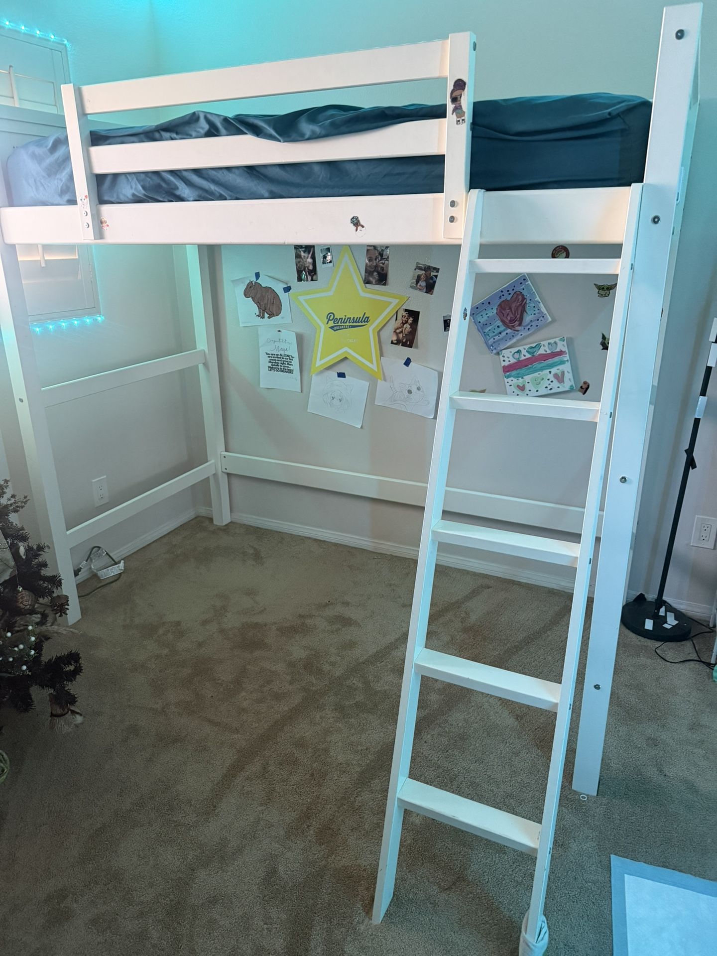 Nice loft bed comes with mattress we just got a bigger bed. Has some stickers that need to be cleaned off