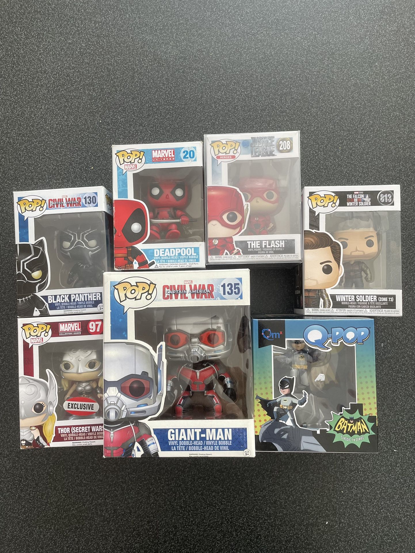 Includes: Marvel: Black Panther (#130, Captain America: Civil War) Deadpool (#20) Thor (Secret Wars, #97) – Exclusive Giant-Man (#135, Captain America: Civil War) Winter Soldier (#813, Falcon & Winter Soldier) DC: The Flash (#208, Justice League) QMX Q-Pop Batman Classic TV Series Condition: All figures come in original boxes. Boxes may show minor shelf wear (see photos). Figures have never been removed from packaging. Price: $70 for total bundle or $10 each. Open to offers