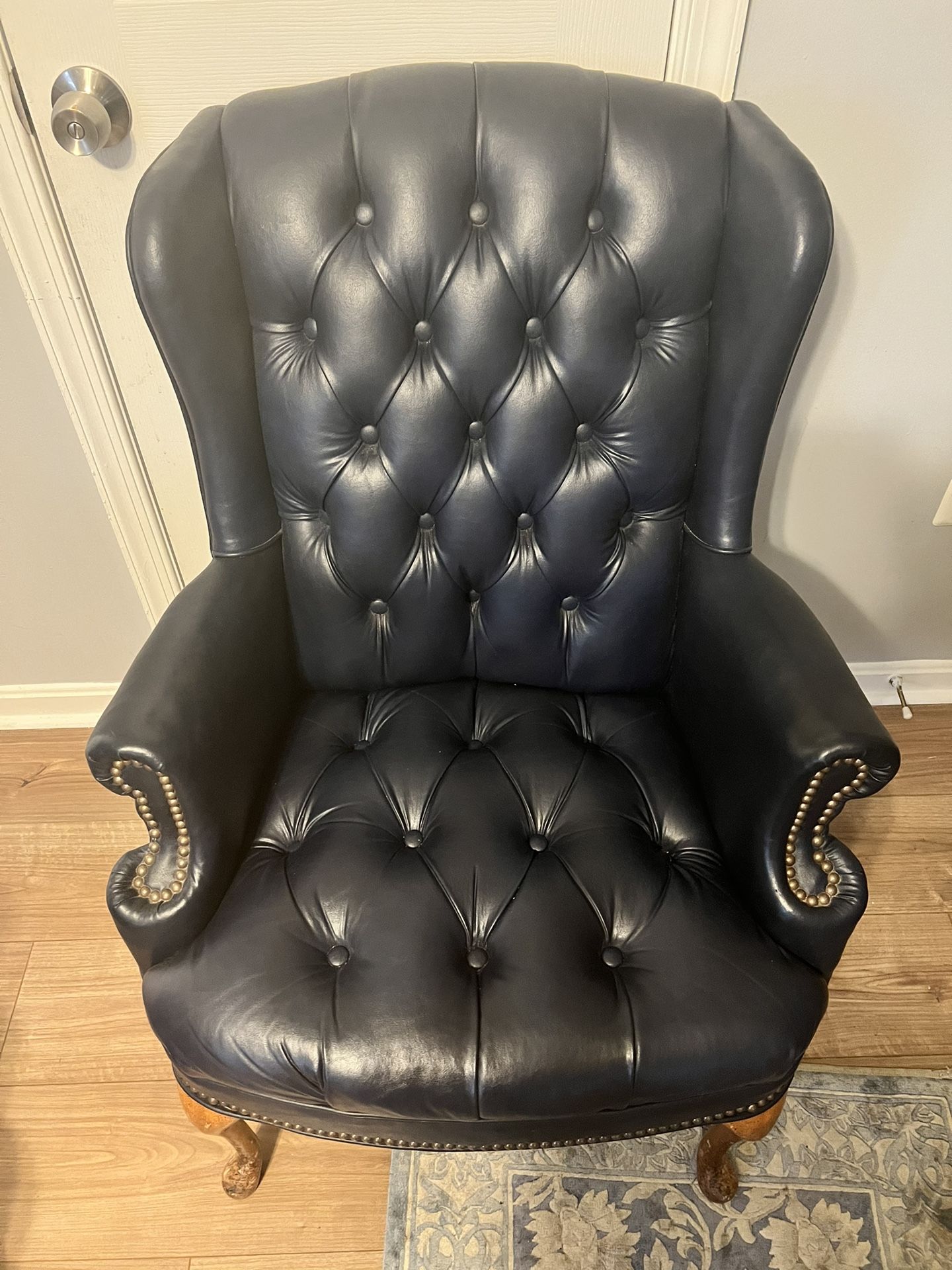 Large high back Navy Blue Leather office chair. Great for office decor or office use. There are 3 of these chairs available.