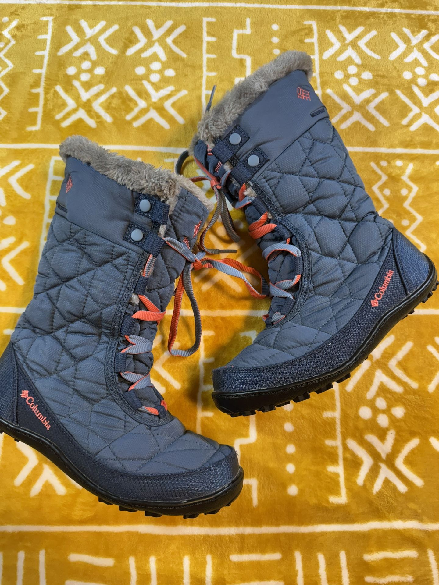 Waterproof quilted boots. Soft fur trim. Stylish orange logo detail. These are in Mint… like brand new condition! Very grippy non slip rubber soles, warm faux fur lined, waterproof and breathable. Quality made from Columbia! Girls Sz 2 Aprox 10” height Color is a Blueish gray with Salmon Pink accents