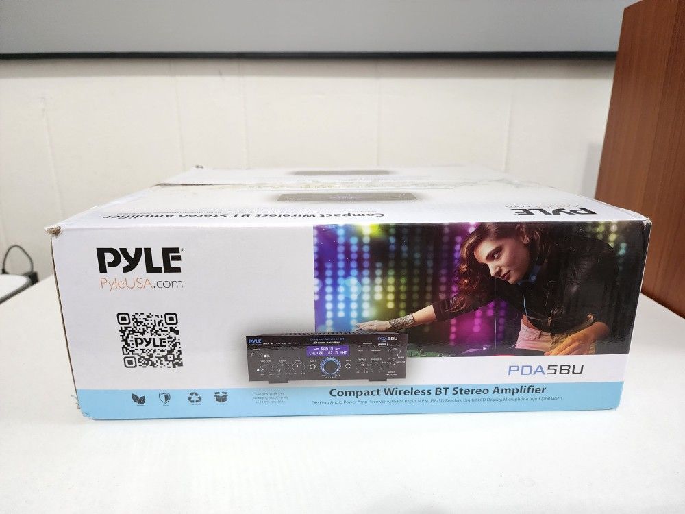 200 Watts Pyle Receiver Amplifier, Bluetooth, USB and SD card reader, 2 RCA inputs, 1 aux input, 1 RCA output, 2 mic inputs.