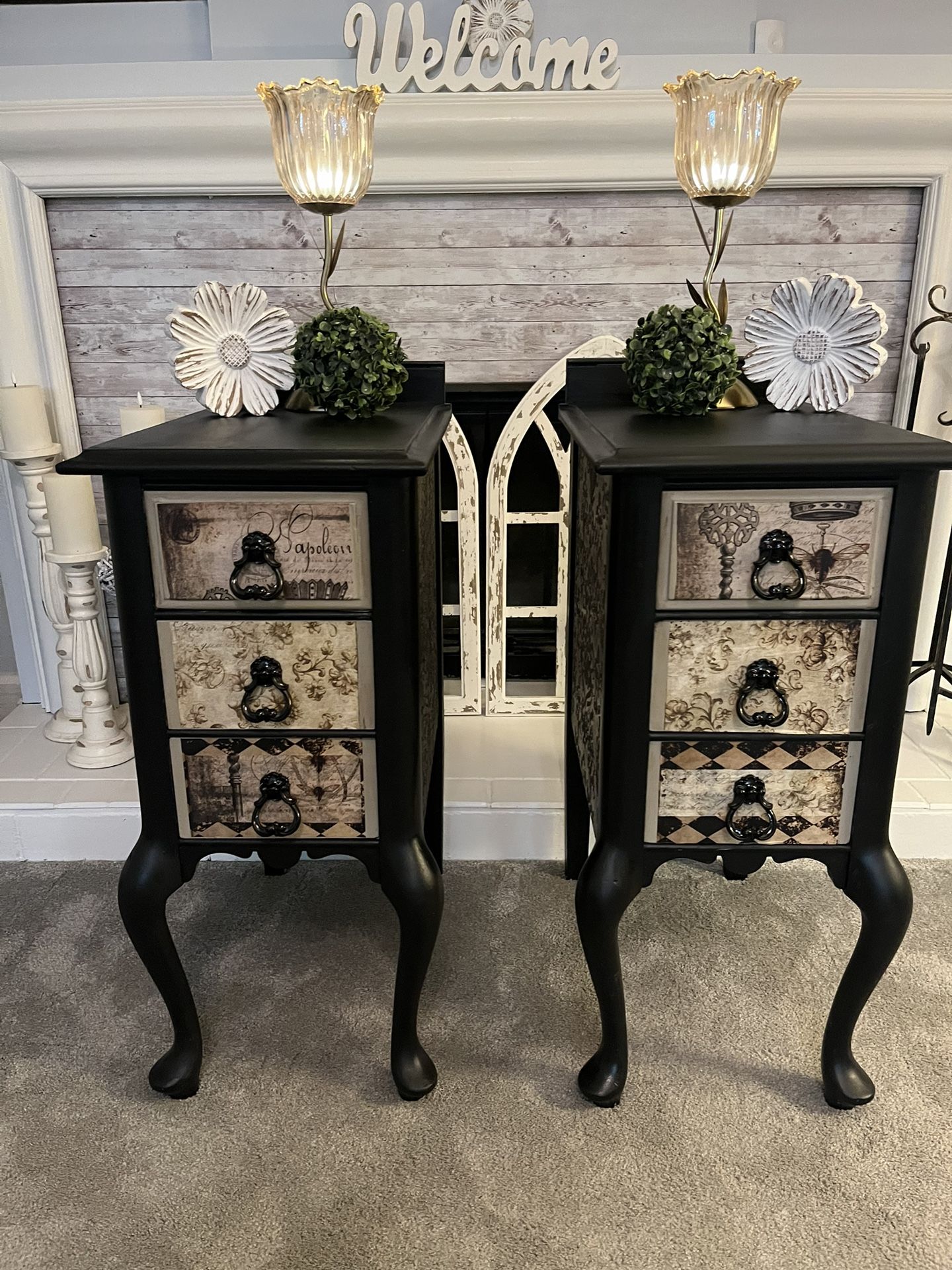 Black matte paint. Custom accent paints. Decoupage and raised stencils. Updated hardware.