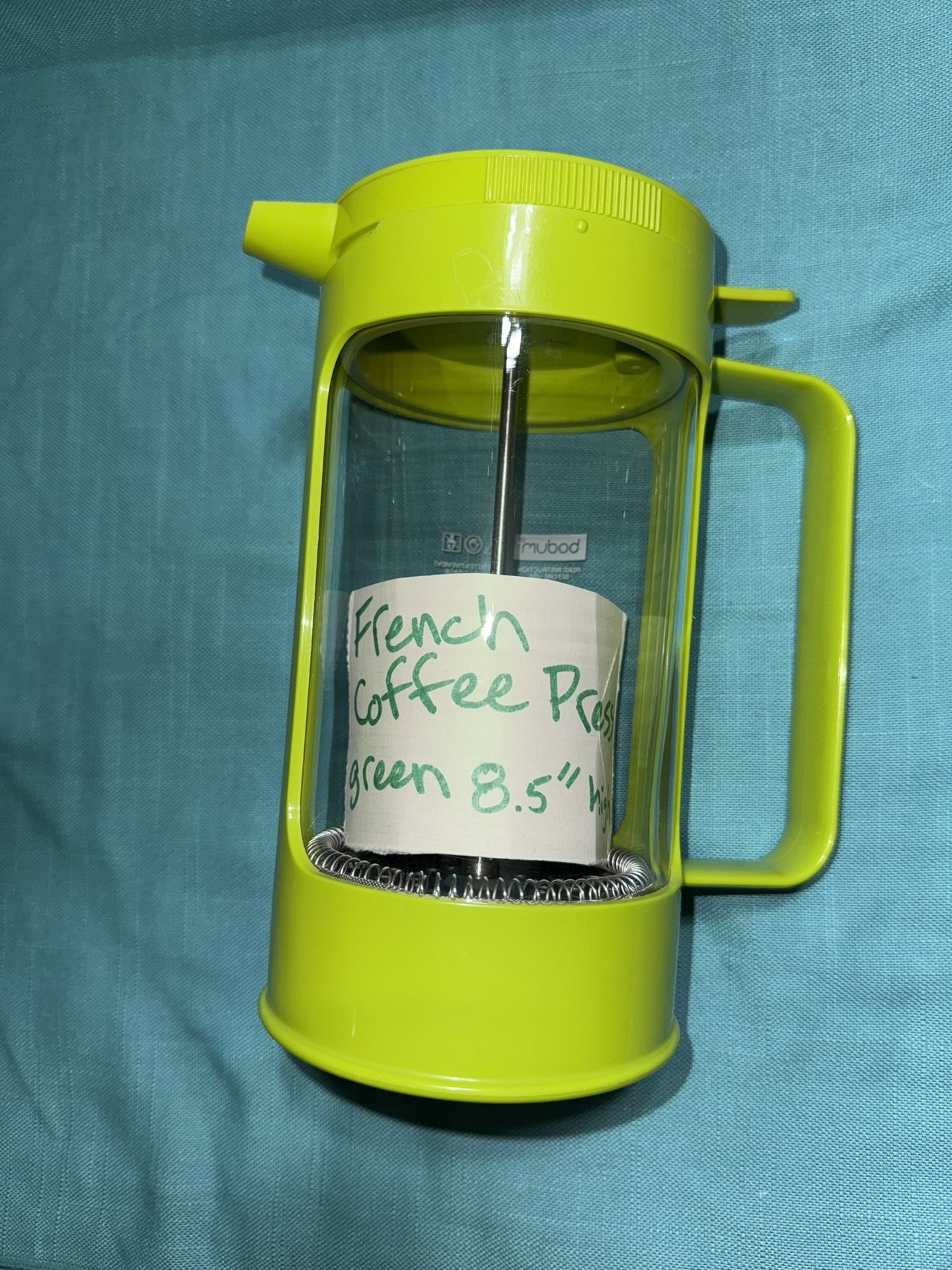 Bodum brand apple/kiwi green 34 ounce/4 cup French coffee press (manual coffee maker). Glass carafe/beaker, spiral plate & stainless steel mesh filter in excellent condition, works perfect. ππ½ Just needs another quick rinse Literally used once. I decided to keep my Bodum pour over coffee drip instead of this one. Okay to make offer. ππ½