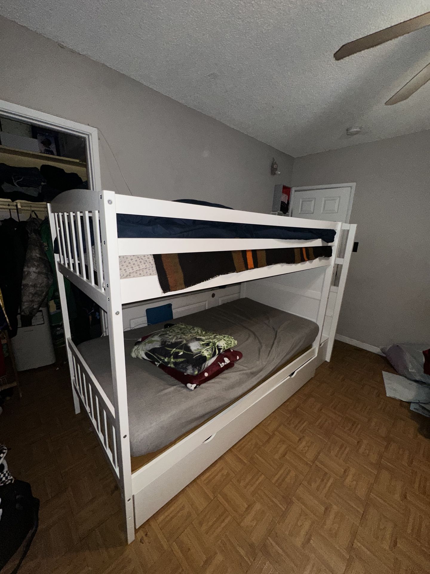 Bunk bed from Amazon. Only selling the frame , not the mattresses! Originally bought for $800+. Selling for 600 or whoever has the best offer as I’ve had several offers already. Only have had for a few months Comes with multiple shelves for extra storage! Will come disassembled when you pick up 📍