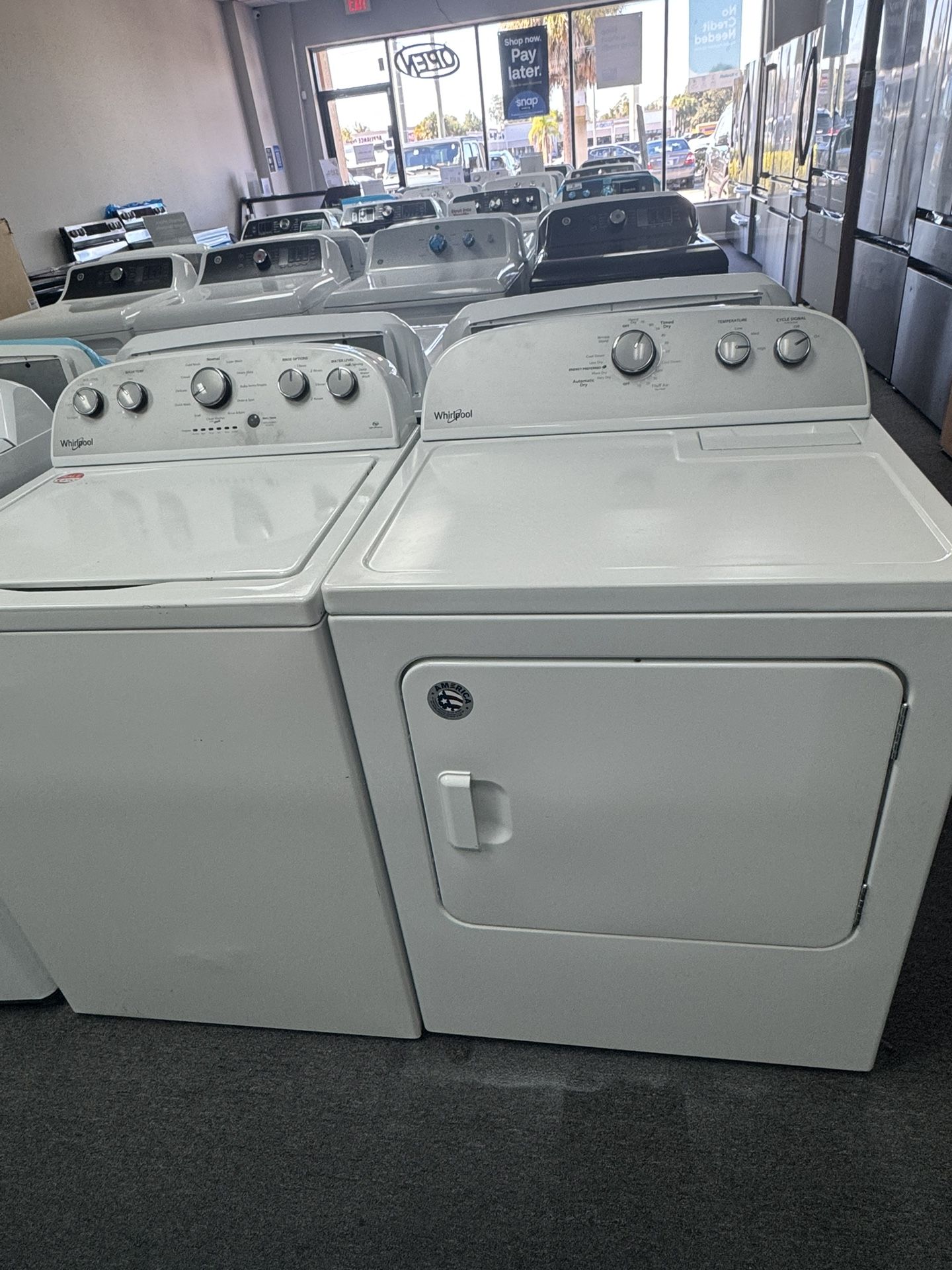 Whirlpool washer and dryer used set We stock washers, dryers, stoves, cooktops, refrigerators, dishwashers and microwaves. Samsung LG Frigidaire Whirlpool Kitchenaid GE Maytag and Bosch We carry new open box, used and scratch and dent appliances 1 year warranty new open box appliances delivery and installation available.