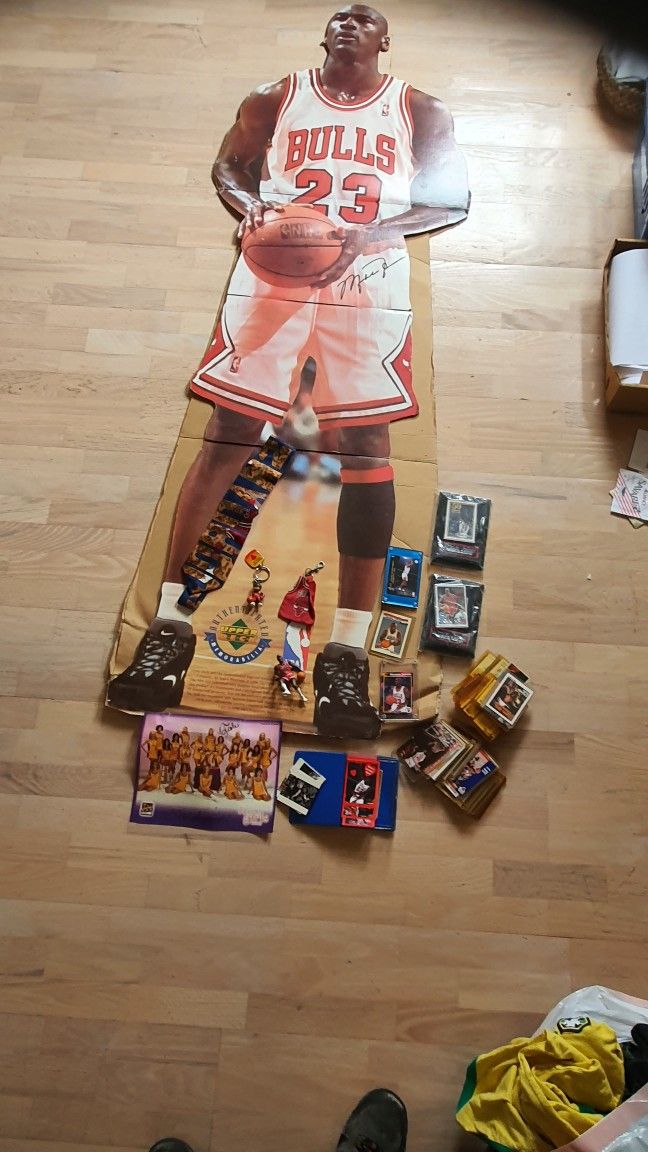 Have all in the pics, about 50 plus collector cards, sweatshirt, tie, final four basketball, MJ key ring, action figure , promotion cups, Jordan box, and more not in poster, Nieman Markus print, Space Jam poster, life size cutout. Might still have a signed pic. My sister used to work for the Michael Jordan Foundation, so some items were gifts that Delores, his Mom would give out. Let's negotiate a price if you're seriously interested. Also have available 3 vintage Magic Johnson plates about 10" diameter. Also have a few signed Jerseys. NOTE: THERE ARE NO ITEMS FOR 200. It's just a starting point to be able to post the ad.