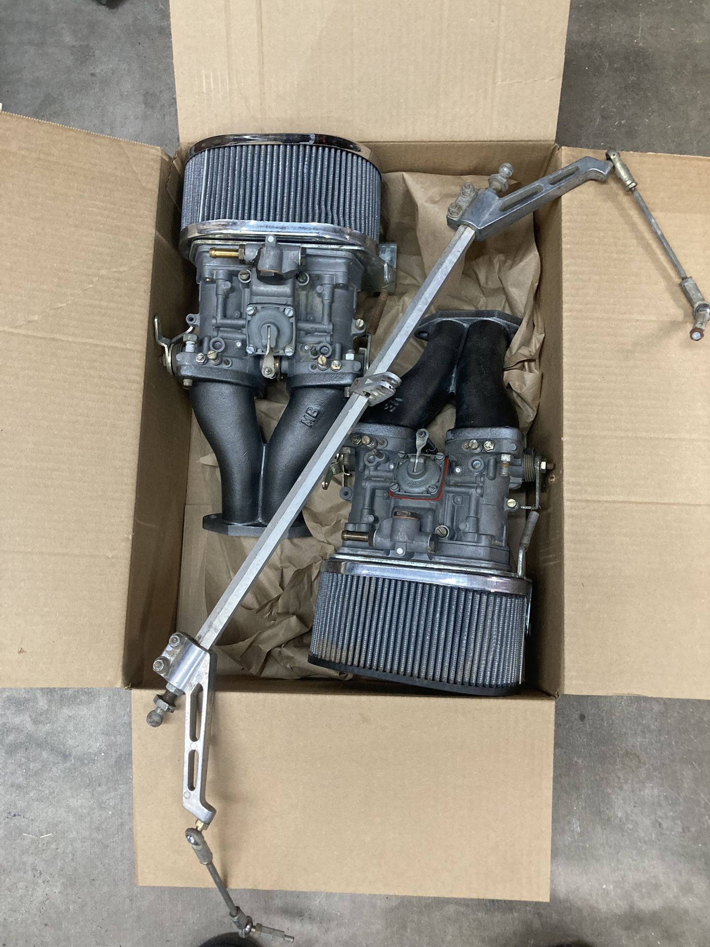Dual Weber 44s. Need a rebuild!!! With linkage and manifolds. Missing one air filter cover no cracks in manifolds $550.