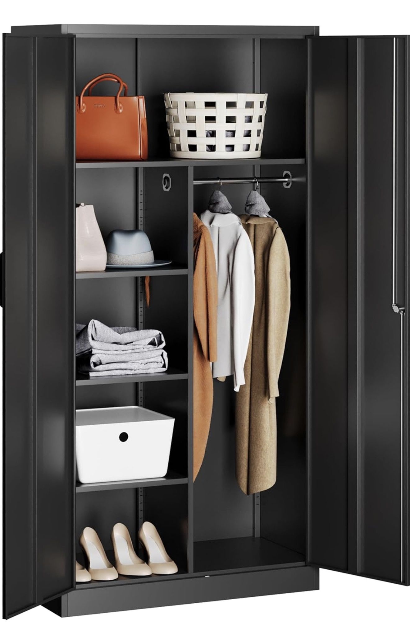 Metal Wardrobe Cabinet with Lock,72" Armoire Closet with Hanging Rod,Lockable Storage Locker,Black Storage Cabinet with Locking Doors,Garage Closet,St