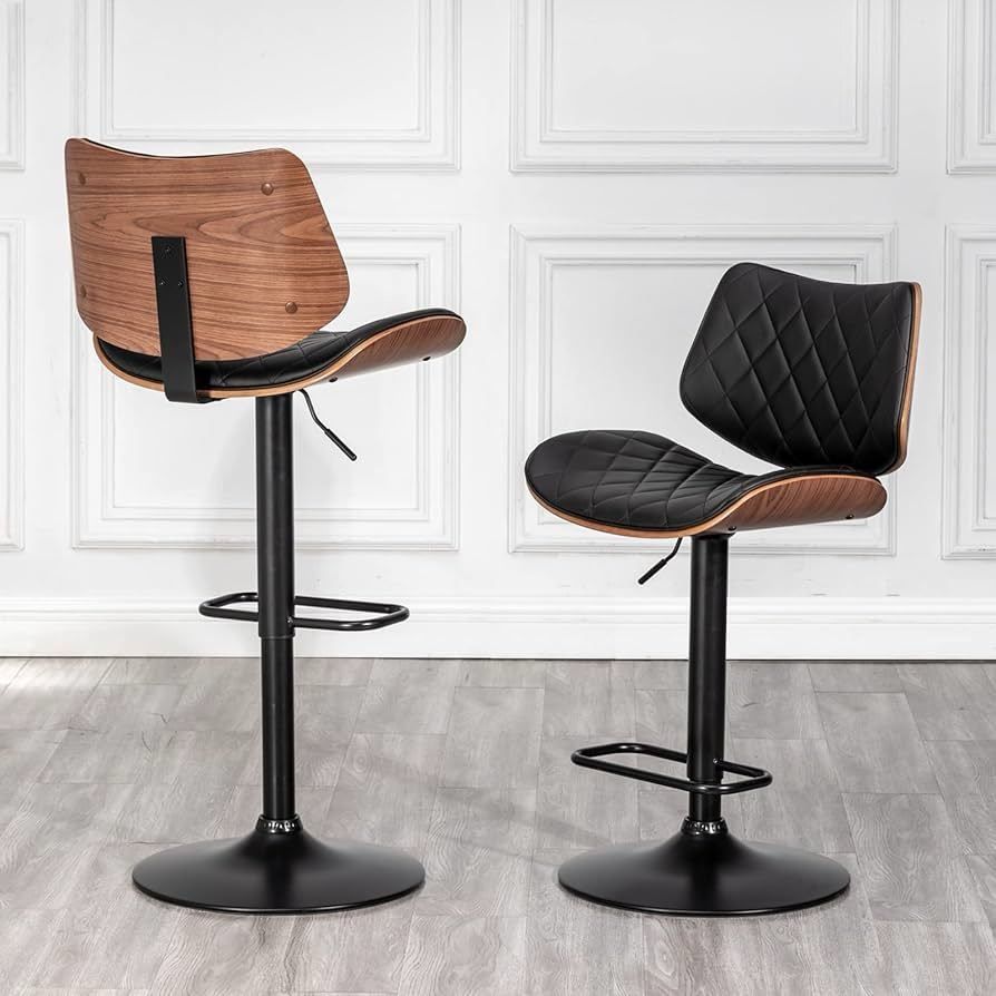P58 Bar Stools Set of 2 Mid Century Modern Adjustable Counter Height Black Leather Upholstered 360°Swivel Bar Chairs for Kitchen Island/Dining Room/Cafe Top highlights Product Dimensions 15.75"D x 20.87"W x 45.28"H Color Black Frame Material Wood and matel Seat Material Type wood and leather and high-density sponge Brand LUNLING Size 24.06"~32.68" With mid-century style bar chair's elegant and generous appearance.Ergonomic design of perfect adjustable height and curved seat supports your back well in sitting.This 360° Swivel bar chair for limitless mobility will increase more fun. With solid walnut bentwood&faux leather and high-density sponge cushion back and seat for durability and longevity.The simple color and high-quality materials make barstool more stylish and unique. Adjustable height is suitable for different heights of people.Equipped with a curved footrest to relax your legs. Large circular iron base with a rubber ring to prevent floor from scratching and increase the anti-slip ability. Stable and sturdy chairs bring your comfortable sitting experience wherever they are.The bar can be placed in living room, kitchen, study or pub. LUNLING Bar Chairs are shipped in one box including a detailed instruction manual, install tool and screws are attached chair leg.Assemble quickly according to the instruction manual.Saving your previous time and energy. 25110-1 8410 black pu