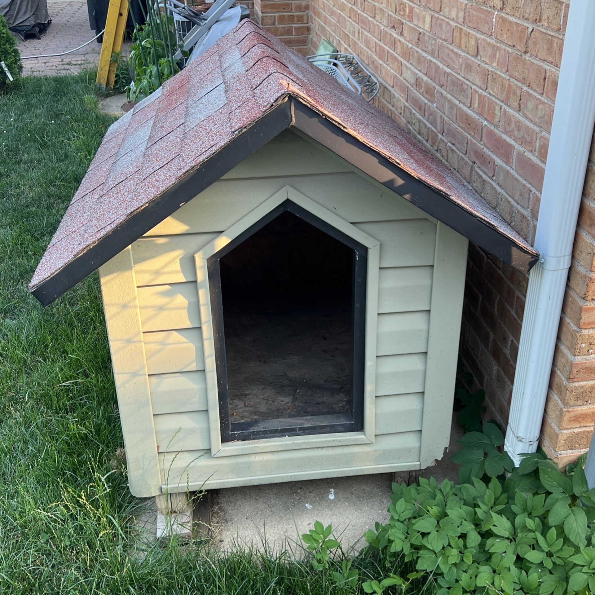 Custom made dog house. Made out of plywood, roof made out of house shingles and regular house siding