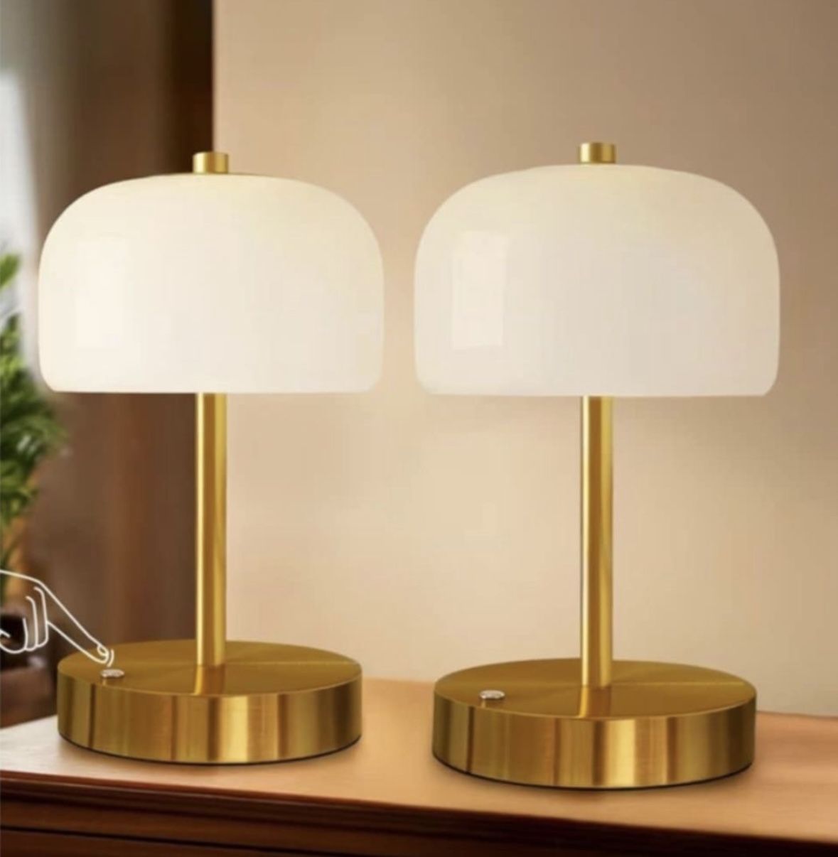 Brand new in box See measurements on the last picture Oneach 9" Cordless Table Lamps Set of 2, Gold Rechargeable Battery Operated Lamp, 3-Way Stepless Dimming Touch Mushroom Lamps, Small Glass Nightlight for Bedroom Dining Table Living Room Shelf Decor