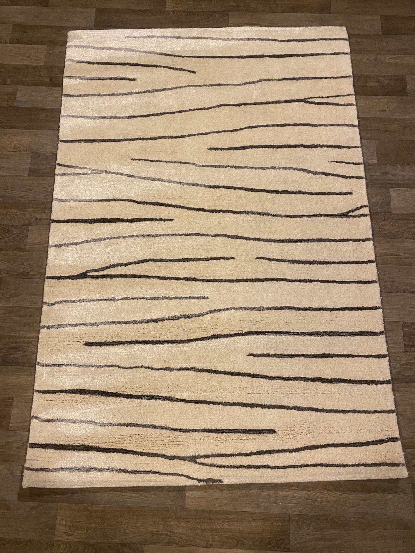 Area rug certified hand woven white with black stripes 3’x5’ New with Tags *Some damage on corner, photos sent on request