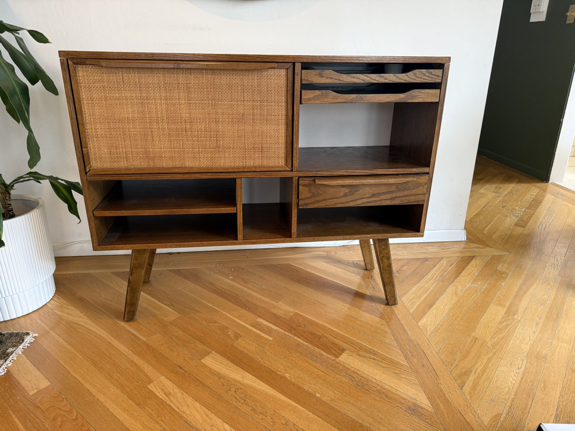 Great condition except for small burn mark from candle on the top. All drawers and doors functioning. Wooden material with rattan facing. Great for a bar or sideboard in living room. Must be able to pick up from the city by 1/30