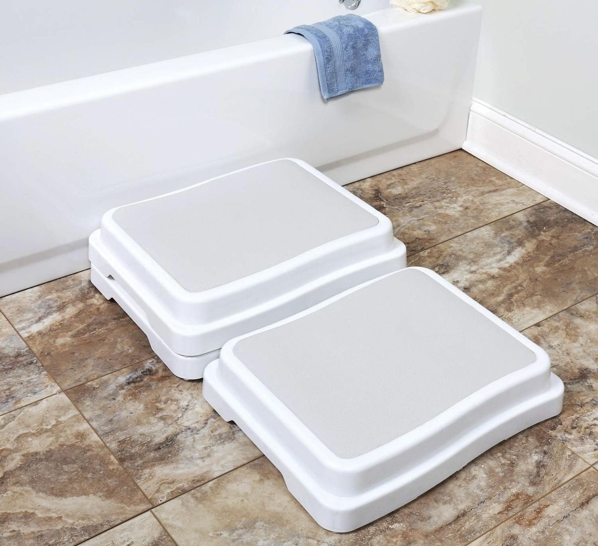 Stackable bathtub steps for seniors. Used for few weeks when parents visited. One step has minor discoloration on top from watery feet but cleaned with wipes and in excellent condition otherwise. Like new Originally paid around 76$