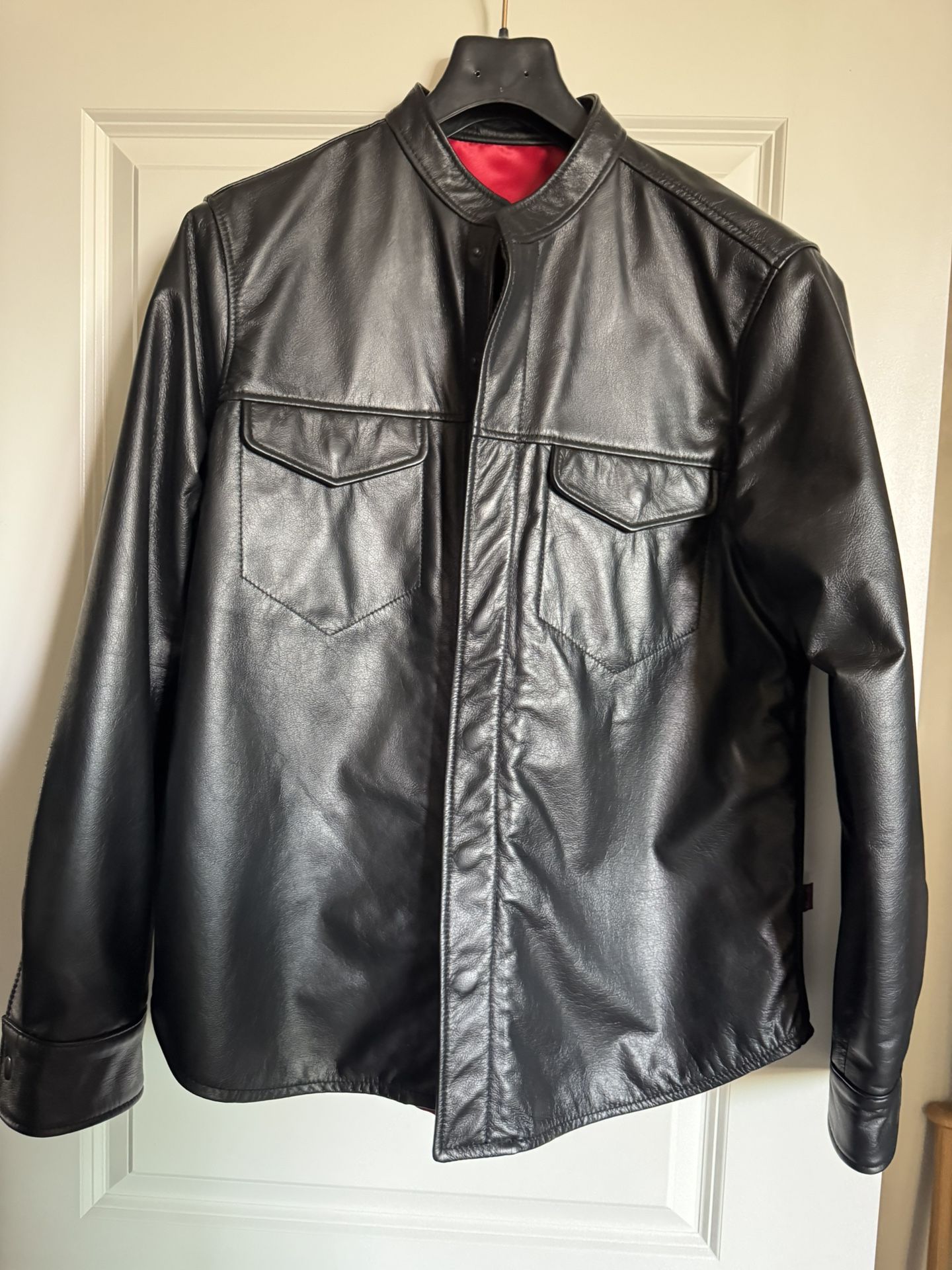 The 415 Clothing Leather Motorcycle Shirt is a stylish and functional piece for any biker or motorcycle enthusiast. Made from high-quality leather with a polyester lining, this shirt features a solid black color and is perfect for casual occasions. With a chest size of 44 inches and a size L, this handcrafted shirt is lightweight, water-resistant, and wind-resistant, making it ideal for riding in the winter and fall seasons. The shirt also includes pockets for added convenience and a touch of vintage style to the overall design. This shirt is beautiful and made in the USA. Supple calf skin looks perfect lined in bright red. Looks amazing! So clean and comfortable. This shirt is new without tags and never worn. Size Large, 44 inch chest. Retails for $575