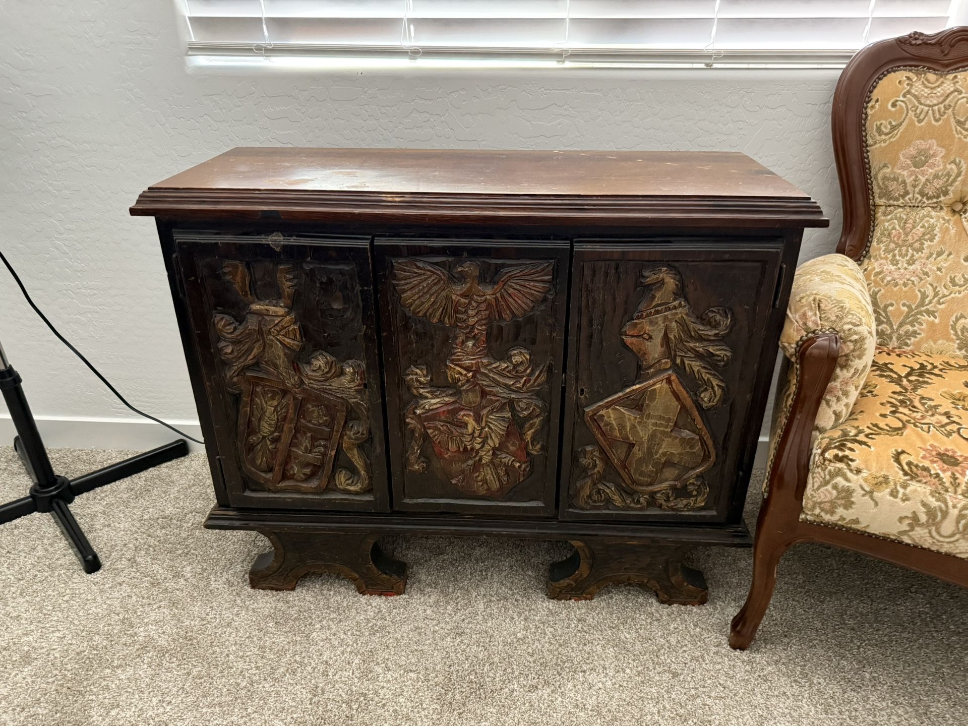Antique cabinet from France! Picked it up while I was stationed in Europe. Excellent piece of French history with carvings of knights. $200 obo. Enjoy! Must pick up in Buckeye, AZ.