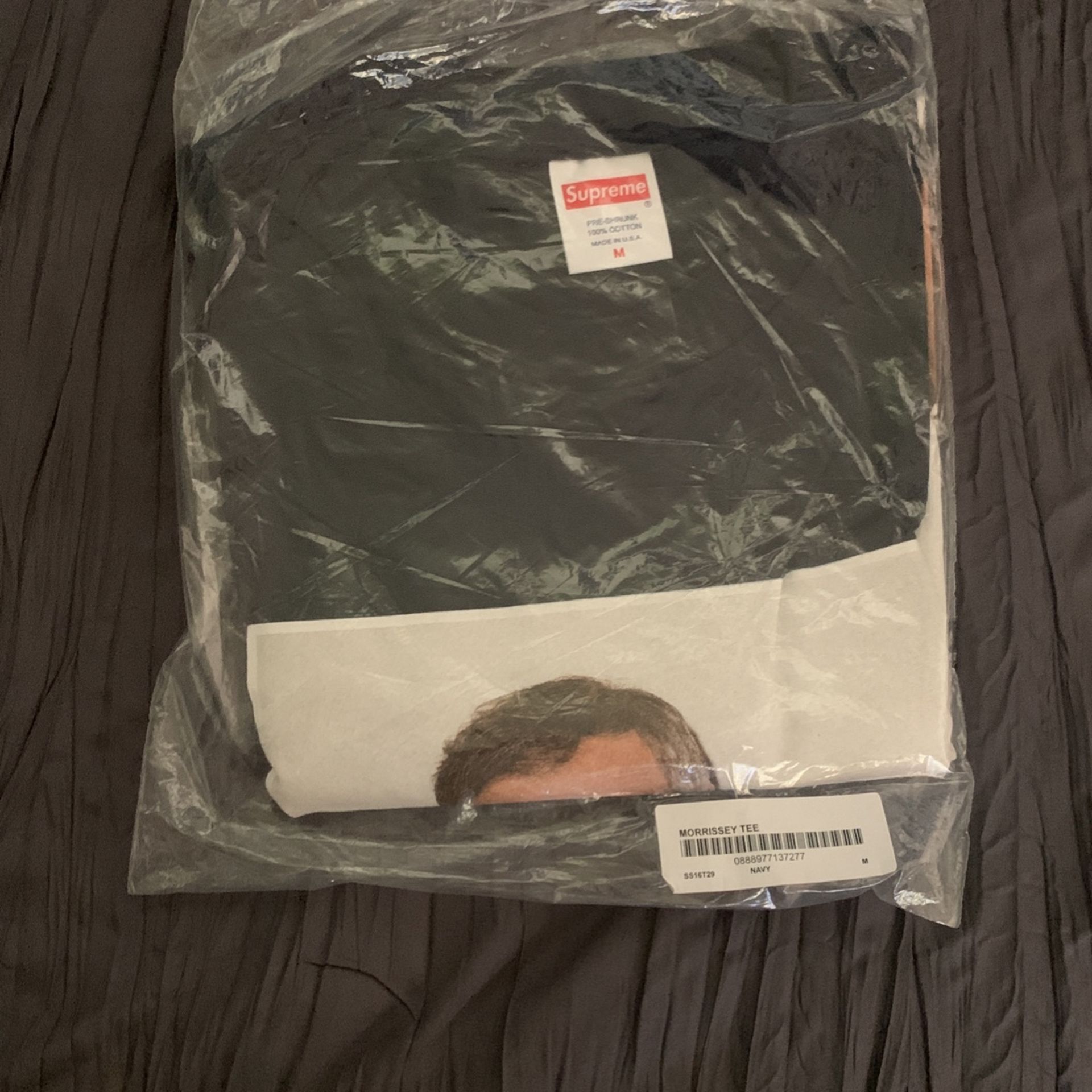 Brand new still in package Supreme MORRISSEY tee. The tee is a medium and color is navy. 100% authentic. Comes from a smoke and pet free home. Meet ups only. Go follow me on Instagram at Floyd Chavez and catch me on YouTube on Floyd Chavez channel