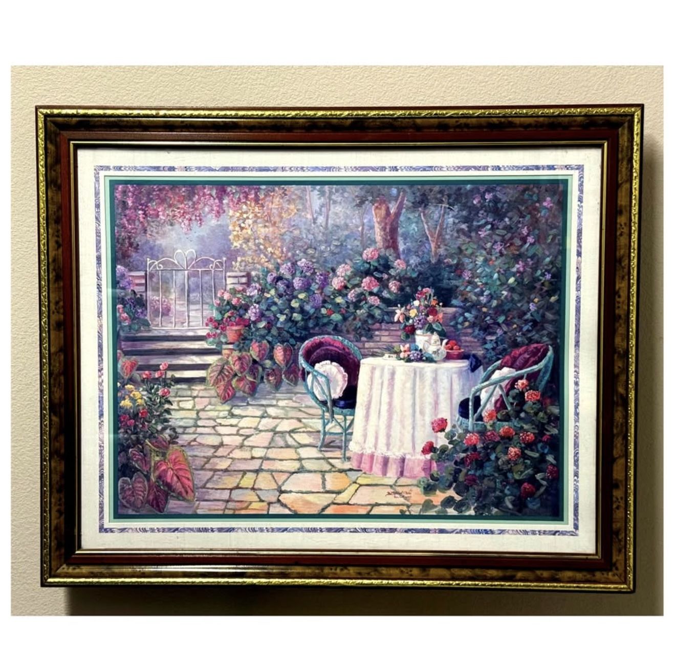 Bring the serenity of a blooming garden into your home with this beautifully framed art print titled "Thru God's Grace" by renowned artist Bettie Hebert Felder. This tranquil piece captures a lush garden terrace, complete with a white tablecloth-covered tea table surrounded by vibrant hydrangeas, ivy, and a gated pathway, invoking peace and spiritual reflection. A perfect addition to any space inspired by faith, flowers, or romantic charm. The print is professionally double-matted and set in a gorgeous wood and gold-accented frame, ready to hang. Details: Artist: Bettie Hebert Felder Title: Thru God's Grace Type: Art Print Subject: Garden, Religion, God's Grace Theme: Flowers, Garden, Religious Item Height: 31 in Item Length: 26 in Size: Large Framing: Framed with glass (wood frame with gold trim) Condition: Excellent vintage condition with vibrant colors; minor wear to the frame consistent with age. Style: Romantic garden scene with spiritual undertones