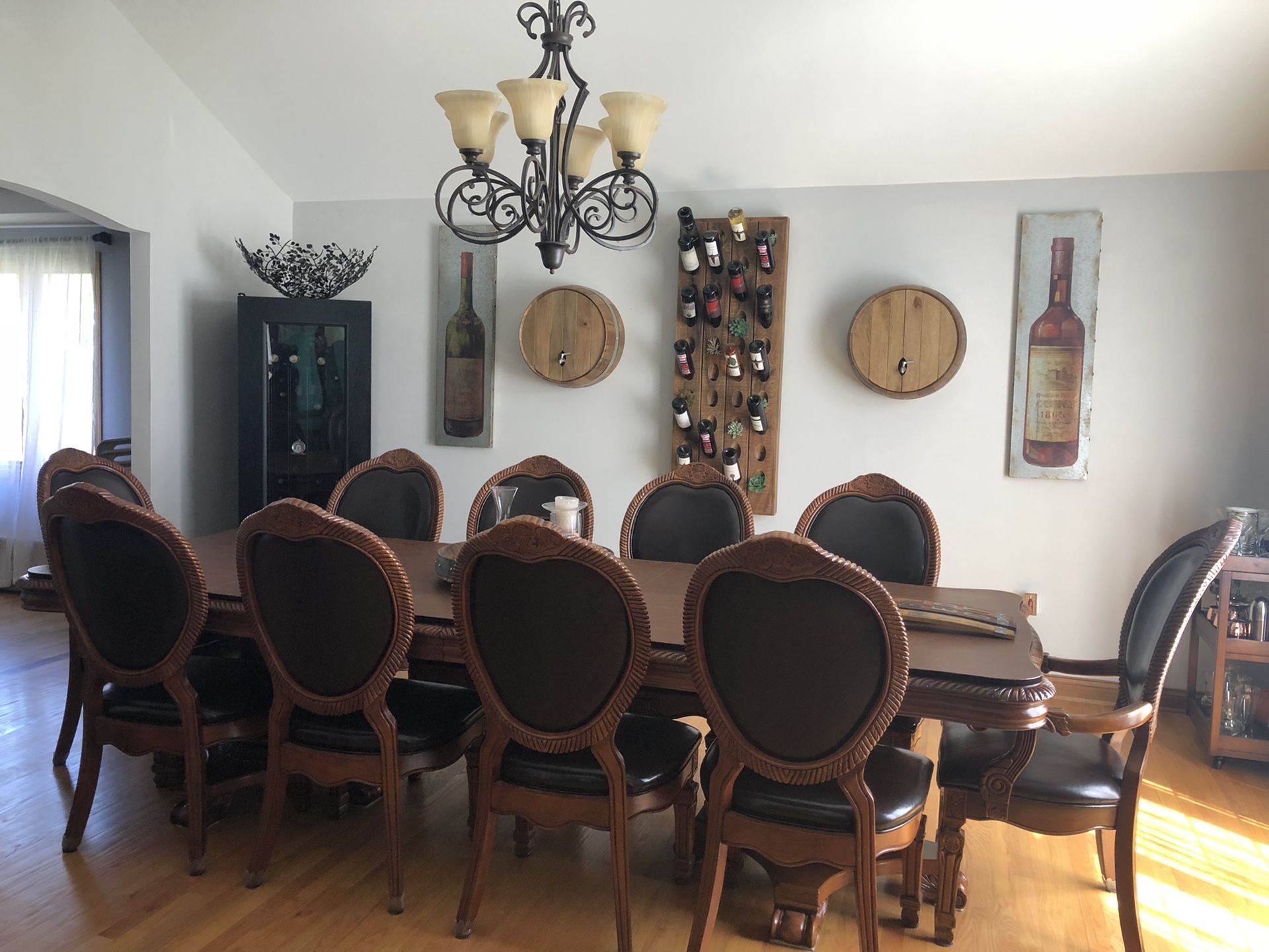 CherryWood 10 Person Dining Table 2 end Leather Arm Chairs , 8 Leather Chairs and Buffet Table Table Color Blended Table Cover I do not answer low ball offers or question about breaking up dining Set