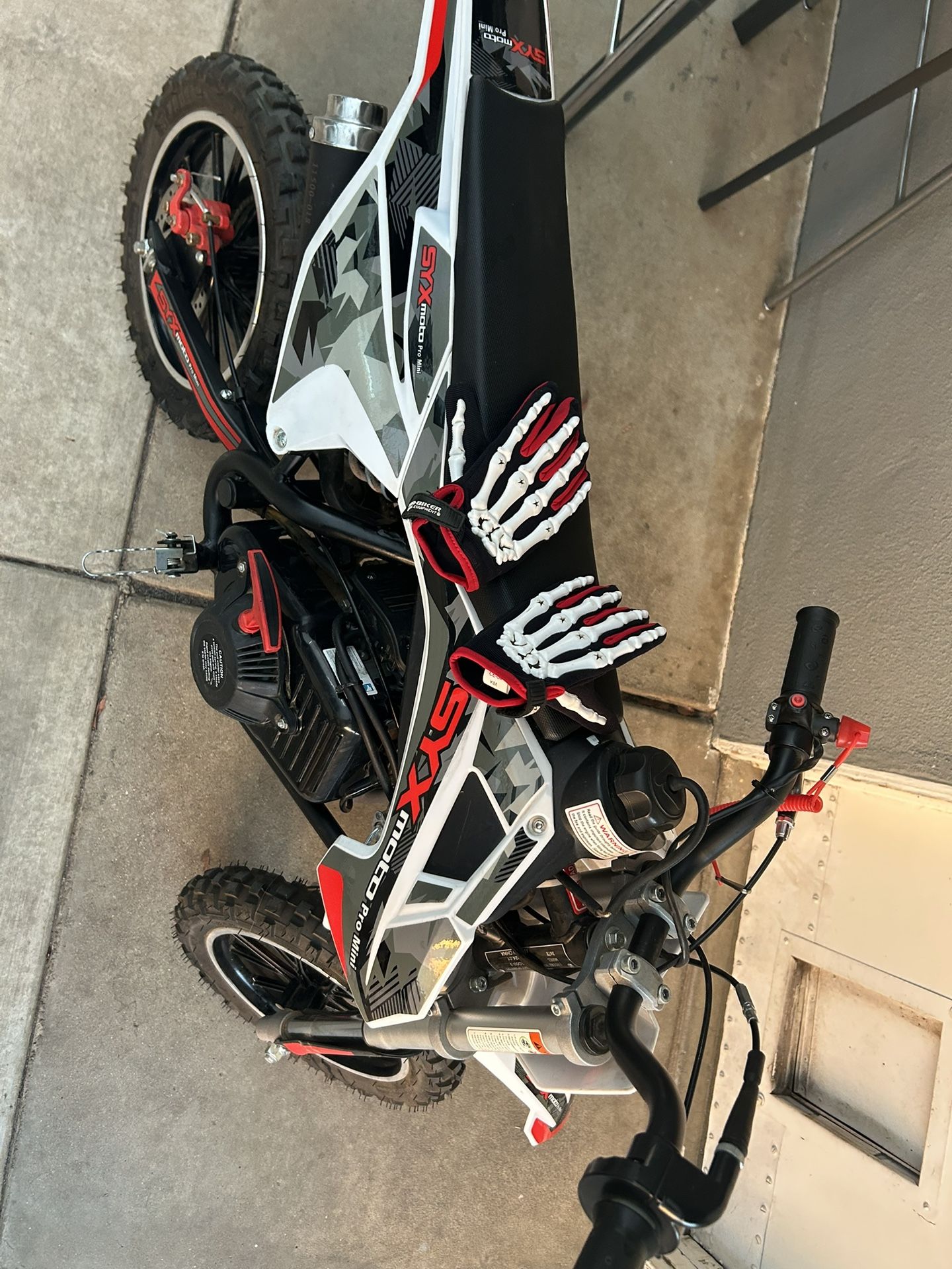 In great shape has an upgraded carb as the original was junk. Starts in 1-2 pulls does about 25mph only needs gas NO pre mix. Bought it brand new Xmas of last year son has just out grown it. As shown in the video it has the bracelet kill switch if your kiddo falls off and the regular kill switch as well. Tires hold air and good tread. Also have a video of it running. Will come with small pair of gloves they fit a 5-8 year old. Even comes with the manual and pink slip.