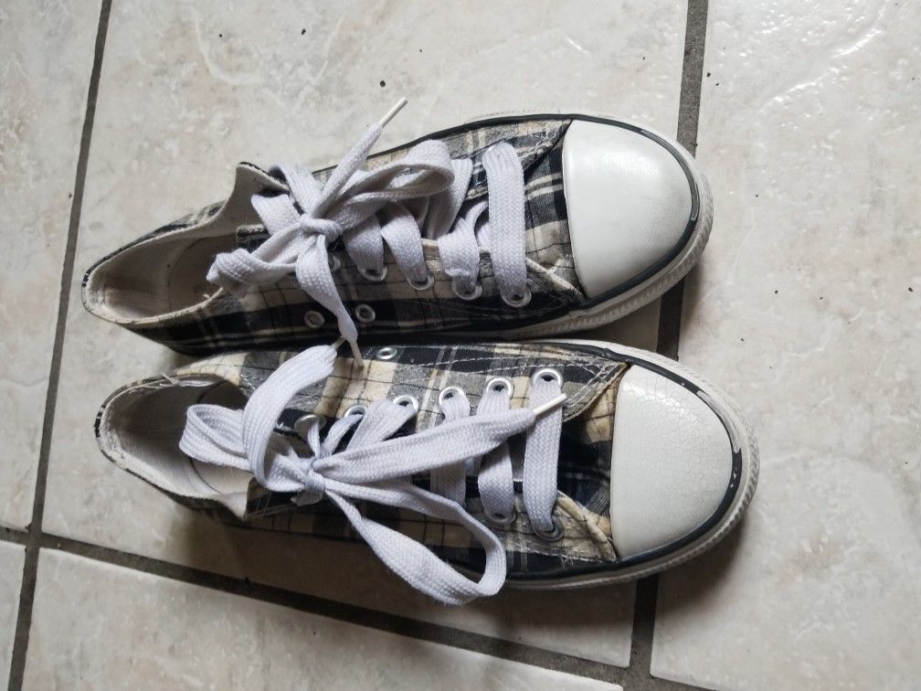 Checkered shoes: 8$... size 6 Red shoes: size 8$... 6.5 Slippers: 4$ ..size 6
