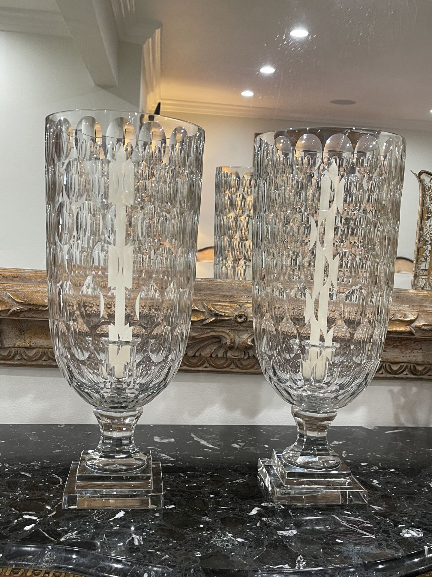 *Serious Inquiries* Pair of Vintage Vaughan Designs Clear Glass Crystal Hurricane Candle Holders- Vases. *Material; High Quality Crystal Footed Square Shape Can function as elegant candle holders or vases. Excellent Condition 18” height 8” wide Pick up Tarzana Sparkling pair clear glass hurricane candle holders. Has pretty textured pattern. Tall design with pedestal base and square foot. Great for candles-vases or just as decorative pieces.