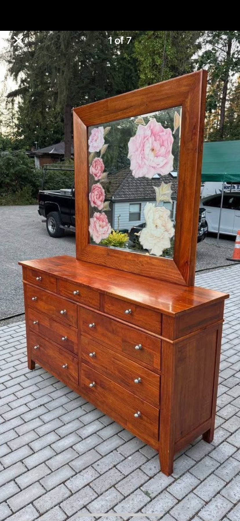 A very nice mango tree wooden dresser. Everything is in very good condition. Flowers on the mirror easy to remove. Measurements: 65.5” long x 39” tall x 19” wide 85” tall with mirror Mirror itself 47” x 47”