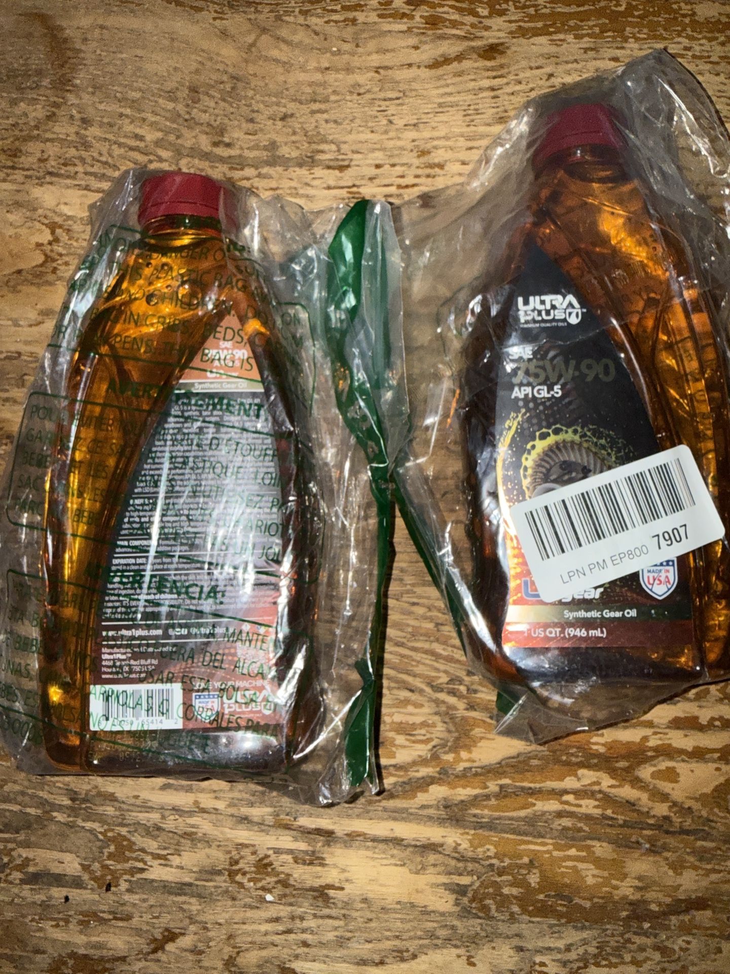 New 75W-90 synthetic gear oil (API GL-5). • 2 bottles • 1 quart each • For differentials and manual transmissions