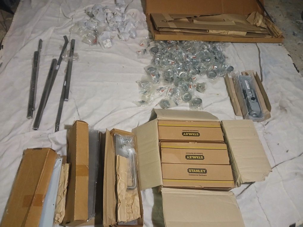 (3) Stanley Security QDC100 SERIES DOOR CLOSERS w/Cover NIB (1) extra additional body NIB . (72) stainless door stops . (27) stainless dome door stops . (3) handle stainless steel handles & push/pull plate . (3) Fire escape accessory arms .. (5) 5 stainless steel kick plates NIB . . Selling all as a lot $800