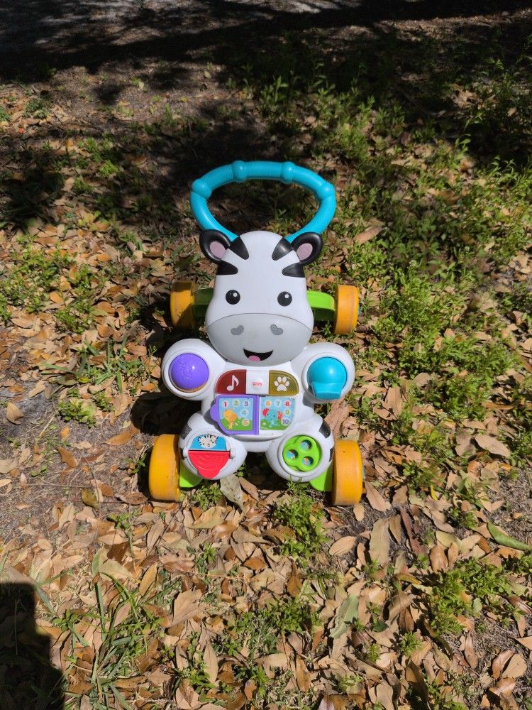 The Fisher-Price Learn with Me Zebra Walker is a toy that can teach first words and encourage first steps. It has a full of hands-on activities for sitting babies, and the easy-grasp handle and sturdy 4-wheel base help steady those wobbly first steps. It can spin, flip, roll, click, and twist.
