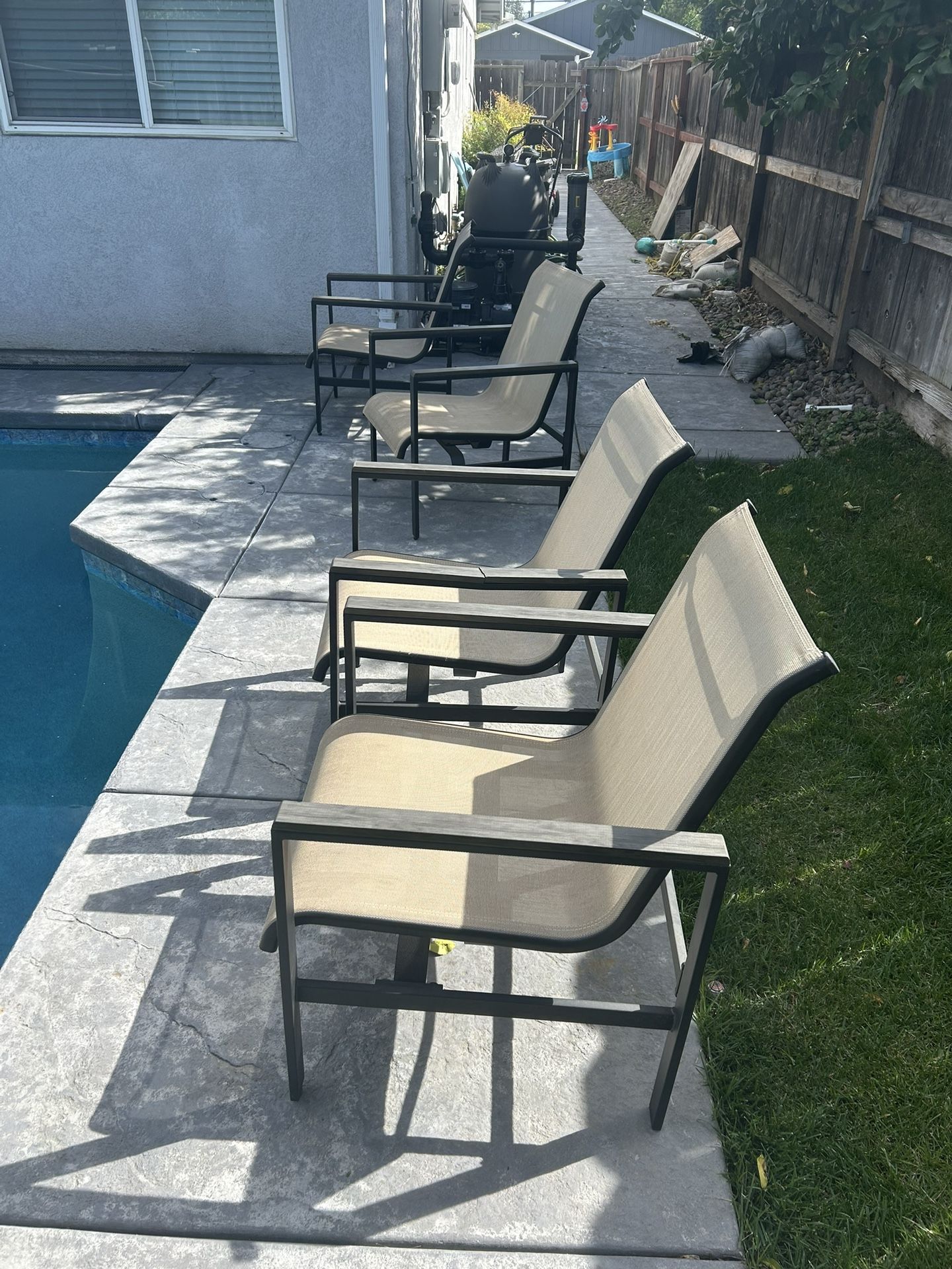 Four outdoor chairs. Made with metal frame (they are heavy!). One chair has a crack in the arm (pictured). Crack is in the plastic top part, not in the metal.