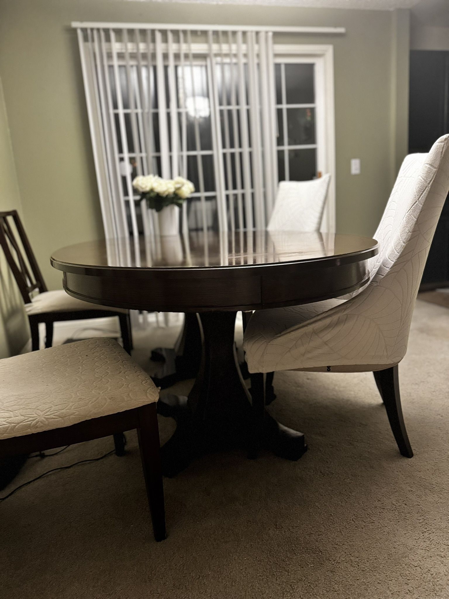 I’m selling a very beautiful wooden dining table made in Vietnam, along with six chairs and a matching TV stand. Two of the armchairs are not in perfect condition — the upholstery is cracked — but with covers on, they look very nice. If that’s not a problem for you, feel free to come and pick it up.