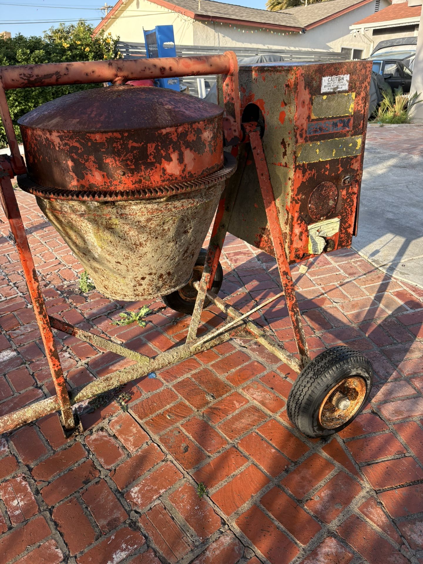 ADD IS UP STILL AVAILABLE . ELECTRIC motor working with belt. Bearing needs to be tightened not engaging. Spend $150 at Harbor Freight and make it gas. concrete, stucco mixer. Tires cracked 1 tire holds air. The other goes flat after 5 hours. 2” inch ball hitch ready to tow, towable. Revolvedor con jalón. Trompo.