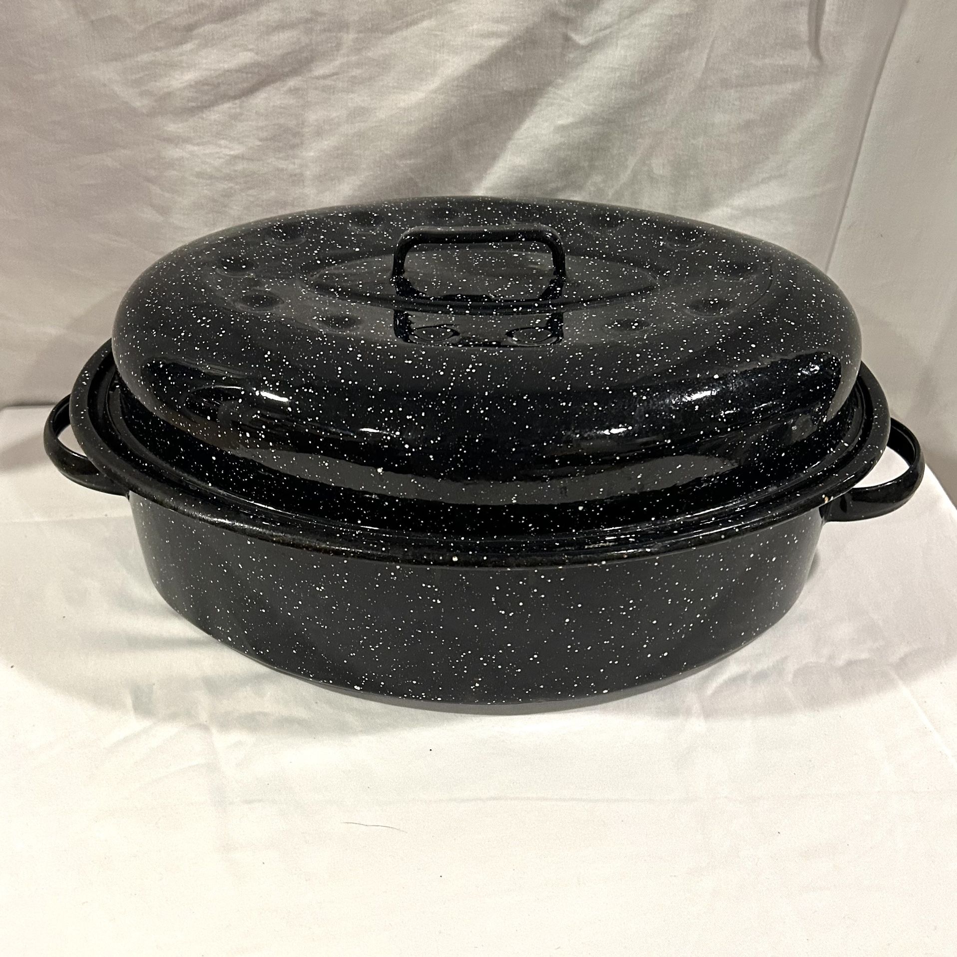 Huge Vintage Black Specked Enamel Roasting Pan Thanksgiving Christmas Some worn spots on interior. See photos